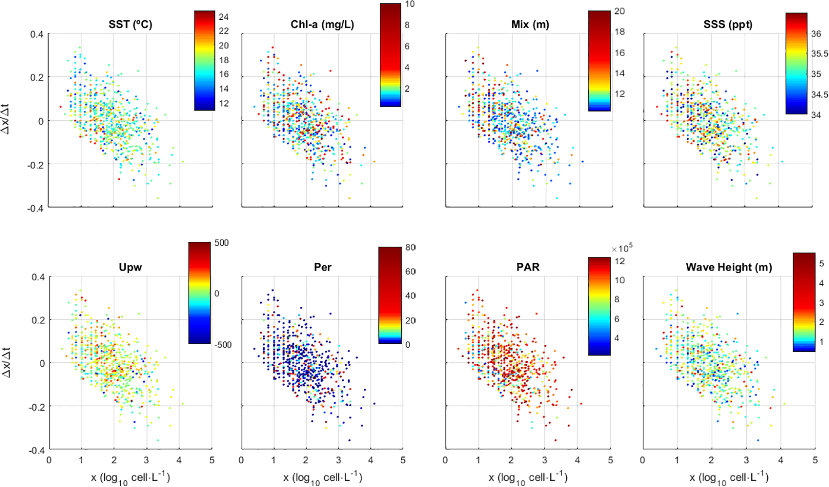 Effect of environmental variables on the population growth (Δx/Δt) of Dinophysis acuminata starting from an initial density x (x=log10n, where n is cell·L-1). Environmental variables where 5-day averaged, namely for Sea Surface Temperature (SST), Chlorophyl concentration (Chl), Mixed layer depth (Mix), Sea Surface Salinity (SSS), Bakun upwelling index (Upw), Precipitation (Per), Photosynthetic Active Radiation, (PAR) and Wave Height.