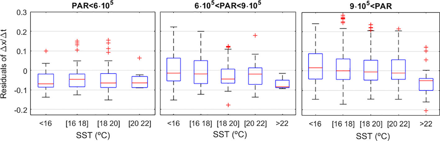 The Δx/Δt residuals and their dependency on PAR and SST. SST is Sea Surface Temperature in °C. PAR is Photosynthetic Active Radiation corresponding to the flux of photons within the 400-700nm wavelengths and given in mol·m-2·s-1. Red line (median), blue box (2nd and 3rd quartiles), whiskers (1st and 4th quartile), red crosses (outliers).