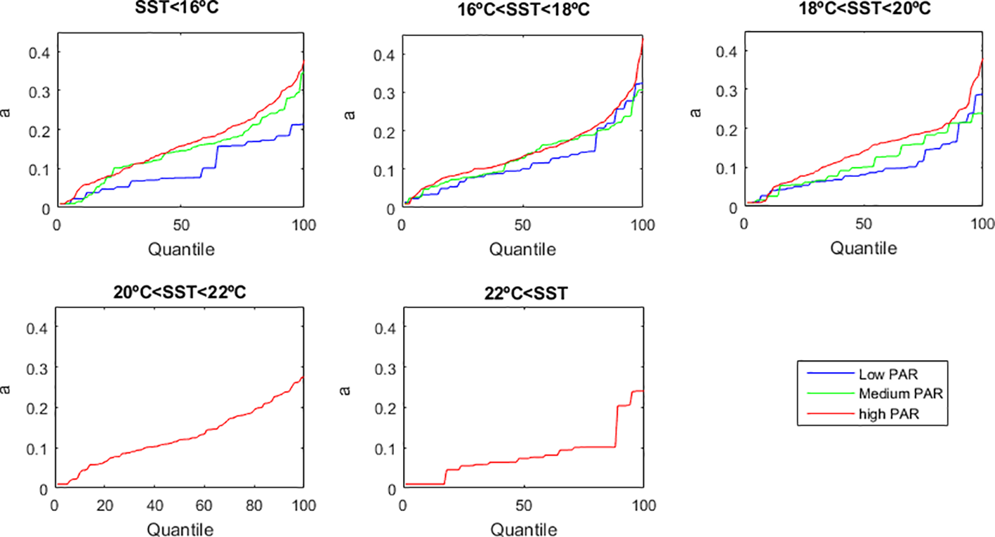 Lateral advection and mixing - due to hydrodynamic processes such as eddies, fronts and turbulence - lead plankton to have patchy horizontal distributions at scales of 1-to-hundreds of meters (Martin, 2003; Pérez-Muñuzuri and Huhn, 2010). The importance of hydrodynamic transport processes in patch formation becomes more relevant as the time-scale of these processes becomes comparable (or shorter) to the time-scale of the phytoplankton reproduction (Okubo, 1978). Furthermore, species of the genus Dinophysis have been detected forming thin vertical layers in upwelling (Moita et al., 2006; Velo-Suarez et al., 2008) and fjord systems (Díaz et al., 2021). Because plankton distribution has high patchiness, its abundance data is commonly uncertain (e.g. Kiørboe, 1993). Therefore, we tested how this uncertainty affected the estimation of parameter a and its dependency on SST and PAR. For that, we estimated parameter a for all quantiles of the x-Δx/Δt bivariate distribution (Figure 6). The results confirmed that, despite all uncertainty in the data, D. acuminata grows better under the conjugation of higher PAR and cooler SST.