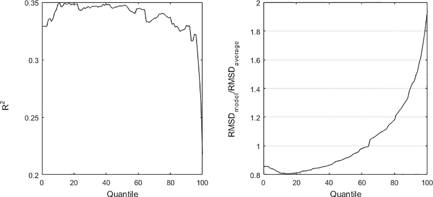 Uncertainty analysis regarding the D. acuminata growth model. The quantile chosen for quantile regression affects the estimation of the maximum growth rate (parameter a), which in its turn affects the model fit to observed data. Model fit to observed data is evaluated by R2 and Root Mean Square Deviation (RMSD) applied to log cell·L-1.