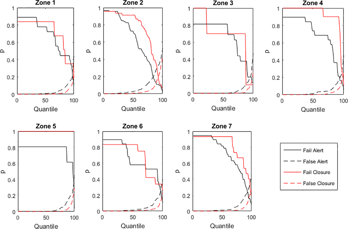 Minimizing the error in the estimates (in the numerical/statistical sense of ‘error’) does not necessarily provide the best decision on whether or not to emit a HAB warning given the 200 cell·L-1 threshold, and whether or not to propose a precautionary closure of shellfish harvesting given the 500 cell·L-1 threshold. In fact, the current model yield a correct warning decision probability p ≈ 0.89 and a correct precautionary closure probability p ≈ 0.94, depending on the monitoring zones. However, such apparently good results have problems. To illustrate these problems, we can conceptualize a given shellfish harvesting zone where 95% of the times the bivalve producers should not be closed. In such case, if the decision-taker adopts as effortless decision criterion to never close the harvesting under any circumstances, 95% of the times he shall be correct. Still, for the remaining 5% of the times, when closure is of utmost importance, he shall always fail. To improve the decision-making process, alternative criteria are required, namely, the probability of failing to emit a warning or failing to propose a precautionary closure (a false negative), and the probability of emitting a wrong warning or a wrong precautionary closure (a false positive). The model was re-evaluated according to these criteria. The uncertainty analysis showed that improving (i.e., minimizing) the probability of emitting a wrong warning or a wrong precautionary closure came at the cost of failing to emit a correct warning or a correct precautionary closure, and vice-versa (Figure 9).