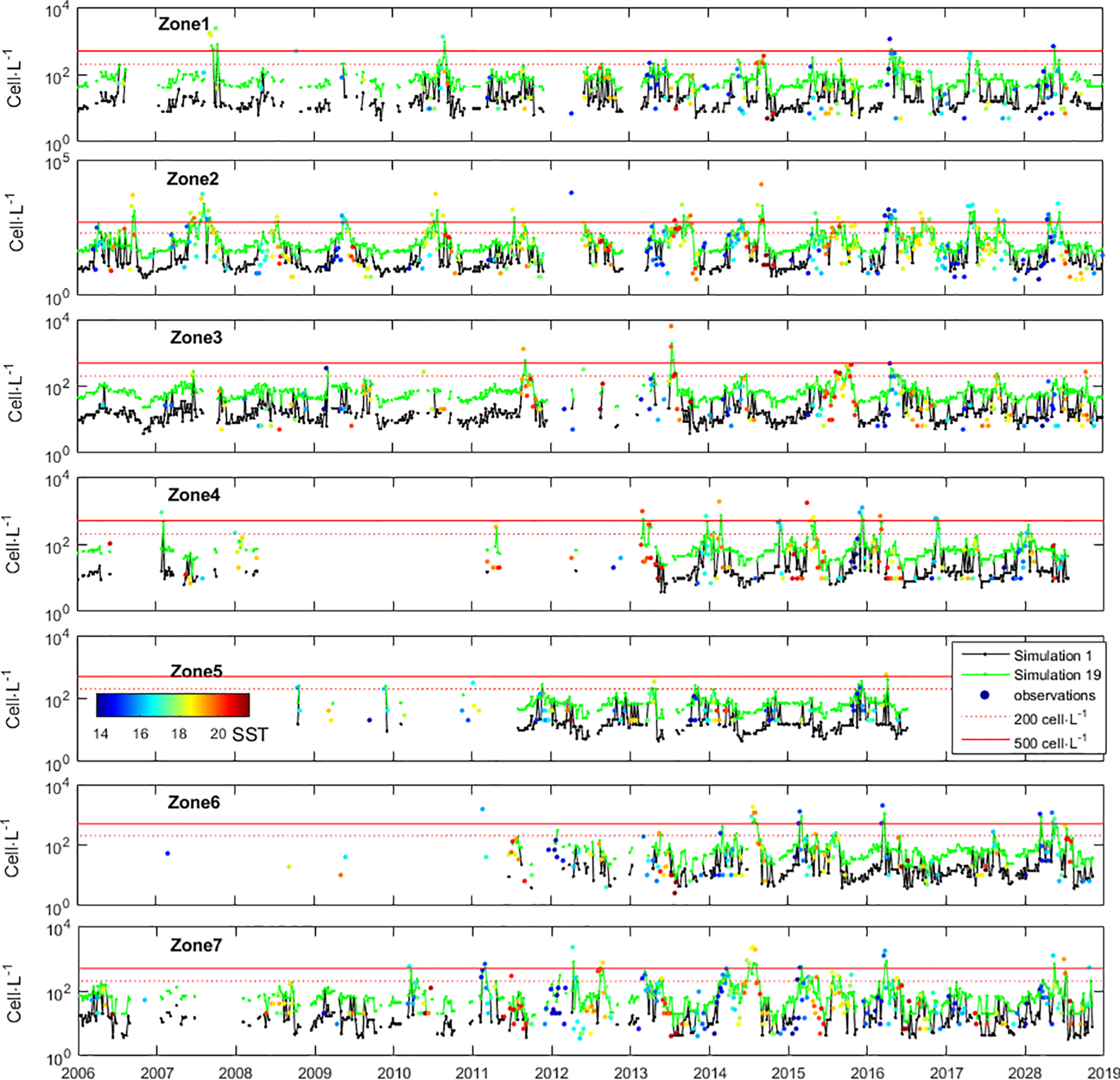 At the biological level, when conditions are favourable, D. acuminata grows at a pace that is too fast to be monitored (or modelled) at 7-day intervals. In fact, under favourable conditions, after 7 days the D. acuminata populations may grow to 5 times larger (Figures 2, 3). At the hydrodynamic level, when the sampler goes back to the same sampling station after 7 days, he can find a different water mass. The D. acuminata population previously sampled was subject to 7 days of advective transport, diffusion, and mixing. Consequently, even during D. acuminata blooms, consecutive samples taken from the same locations show high variability (Figure 7). The stated laboratory detection limit implies that any real cell density of microorganisms in the seawater below 20 cell·L-1 was arbitrarily considered as 0 cell·L-1 (actually, any value within 0 and 20 could be arbitrarily chosen). Arbitrarily setting these observations to zero disabled their use both for model estimation and model simulation because log100=-∞. From a modelling perspective, whatever the value arbitrarily chosen, these observations should not be used because they carry great uncertainty (or eventual bias). Besides being a problem for parameter estimation, this uncertainty was also a problem for model simulation. Any initial density (nt) of 0 cell·L-1 always remained 0 cell·L-1 whatever the growth rate R. In order to run the model from those time instances, these observations needed to have arbitrarily attributed a value greater than zero and lower than 20 (i.e., 0<nt<20). In theory, any value within these boundaries is equally acceptable. However, the consequences of choosing different values was significant. To understand the problem, consider the D. acuminata growth under the most favourable PAR and SST. If starting with 1 cell, after 7 days of growth, the result would be 17 cells, which was still under the detection limit. This may justify why, even under environmentally favourable conditions, observations of 0 cells·L-1 were often followed by new observations of 0 cell·L-1 at the next census. However, if starting with 19 cells, after 7 days of growth, the result would be 286 cells. This may justify why observations of 0 cell·L-1 sometimes surprisingly burst to observations above the thresholds for warning at the next census. It was because all the conditions were met for that burst: the PAR, the SST and an initial population density that was big enough, although under a detection limit that is too high due to limited resources. To illustrate the broader effect of this bias (i.e., over all zones during the entire monitoring experiment), the model was first simulated with all original values of 0 cell·L-1 being replaced by 1 cell·L-1 (Figure 10 - Simulation 1). The simulation fit to observations, although failing in some situations. Then, all original values of 0 cell·L-1 were instead replaced by 19 cell·L-1, leading to a largely different model simulation (Figure 10 - Simulation 19).