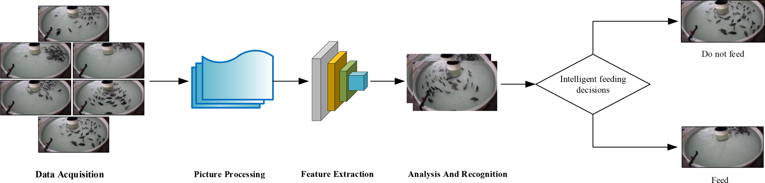 At present, the application workflow of computer vision technology in the field of intelligent bait casting is typically illustrated in Figure 1. Video footage capturing fish under various conditions is collected using cameras and other equipment, followed by extraction of relevant features through appropriate machine learning algorithms. These extracted features are then analyzed and processed to facilitate intelligent decision-making regarding the optimal amount and timing for bait casting.
