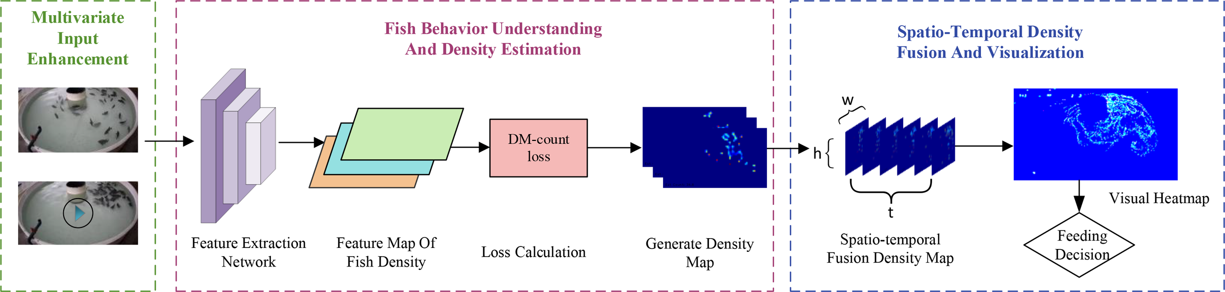 In light of these challenges, we proposed a novel method for real-time analysis of fish feeding behavior based on density distribution(FishFeed), aiming to address the increased accuracy and real-time requirements in intelligent feeding decision-making problems. As illustrated in Figure 2, FishFeed comprises three components: a multivariate input enhancement module, a fish behavior understanding and density estimation module, and a spatio-temporal density fusion and visualization module. Among them, the multi-input enhancement module integrates real-time video stream analysis, image preprocessing, and feature recognition functions, breaking through the limitations of traditional models when dealing with a single data type, thereby enhancing the adaptability and robustness of the model when dealing with dynamic fish school scenarios. In addition, the spatio-temporal density fusion module combined with the intelligent baiting strategy based on the attention mechanism not only improves the monitoring and analysis accuracy of the fish feeding behavior but also effectively quantifies the aggregation and dispersion behavior of the fish school, providing strong support for efficient baiting decisions. The process of the FishFeed method is described below.