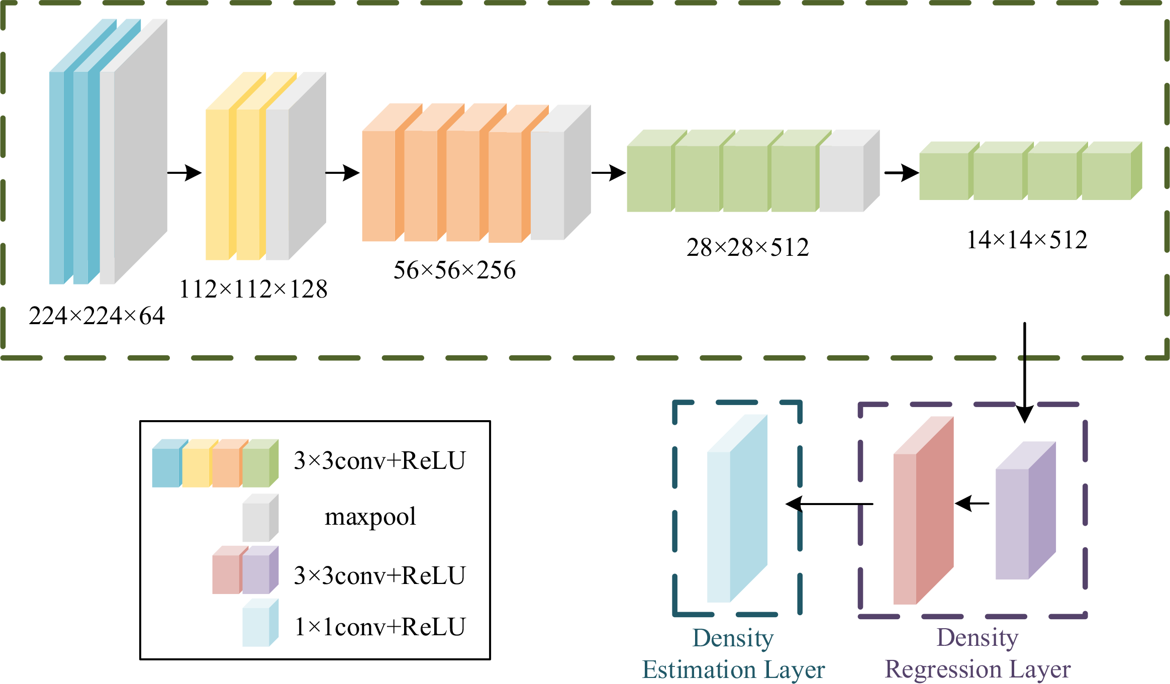 But the VGG19 model also has some problems, such as consuming more computing resources and using more parameters. Among them, the main reason is that the VGG19 model contains three fully connected layers, and the vast majority of parameters in these fully connected layers are from the first fully connected layer, which leads to more memory usage. However, in this paper, we do not need to classify or regression the extracted fish school features, but to generate a predicted density value map based on the extracted features to estimate the fish school density in the image. Therefore, there is no need to rely on the complex fully connected layer structure in our fish school density estimation algorithm. The VGG19 Variant we used in the fish density estimation algorithm is compared with the original VGG19 model, and the comparison results are shown in Table 2. VGG19 consists of a 19-layer neural network with 16 convolutional layers and 3 fully connected layers, while the VGG19 Variant contains only the original 16 convolutional layers and the new 3 convolutional layers.