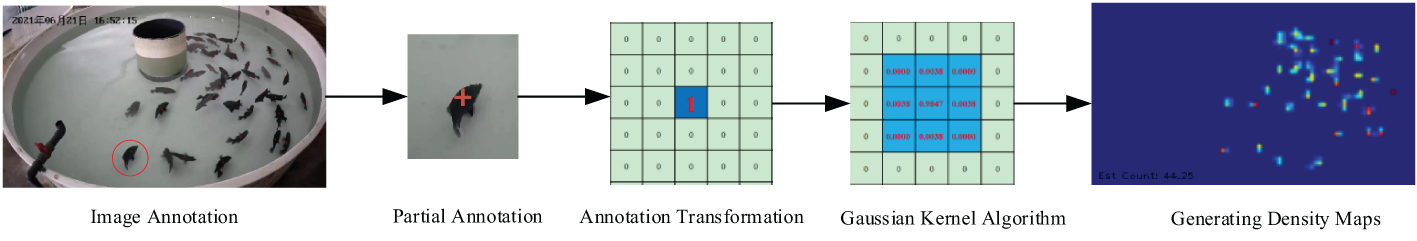 Firstly, the VGG19 Variant network is used to extract features from fish school images, obtaining a rich feature representation. Then, these features are inputted into the DM-Count loss function to calculate the loss and perform backpropagation, optimizing the model’s parameters. During the prediction process, density maps are generated through an adaptive Gaussian kernel density map generation method to supervise the training process of the model. Finally, after multiple iterations of training, a model capable of real-time, accurate estimation of fish school density distribution is obtained.