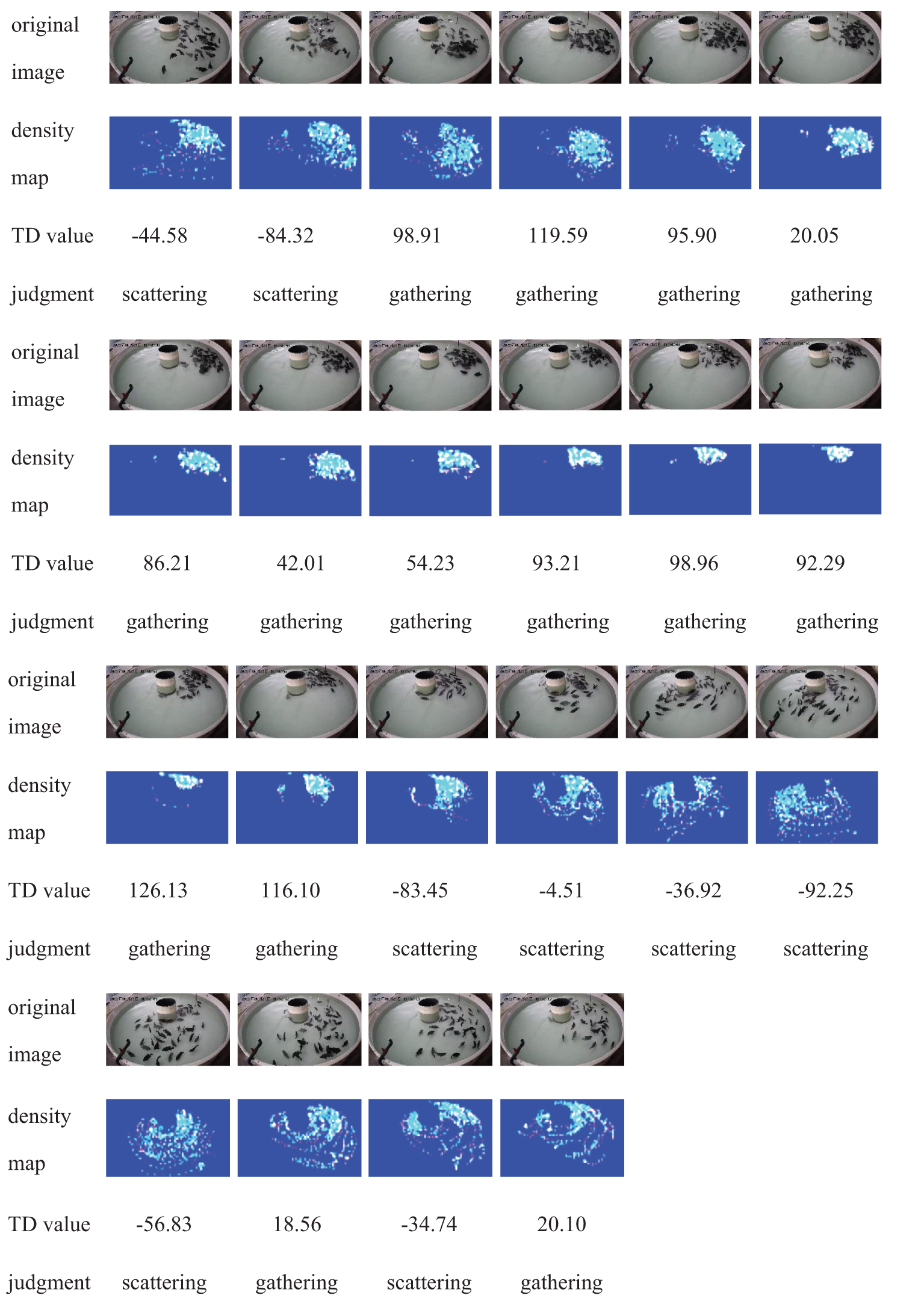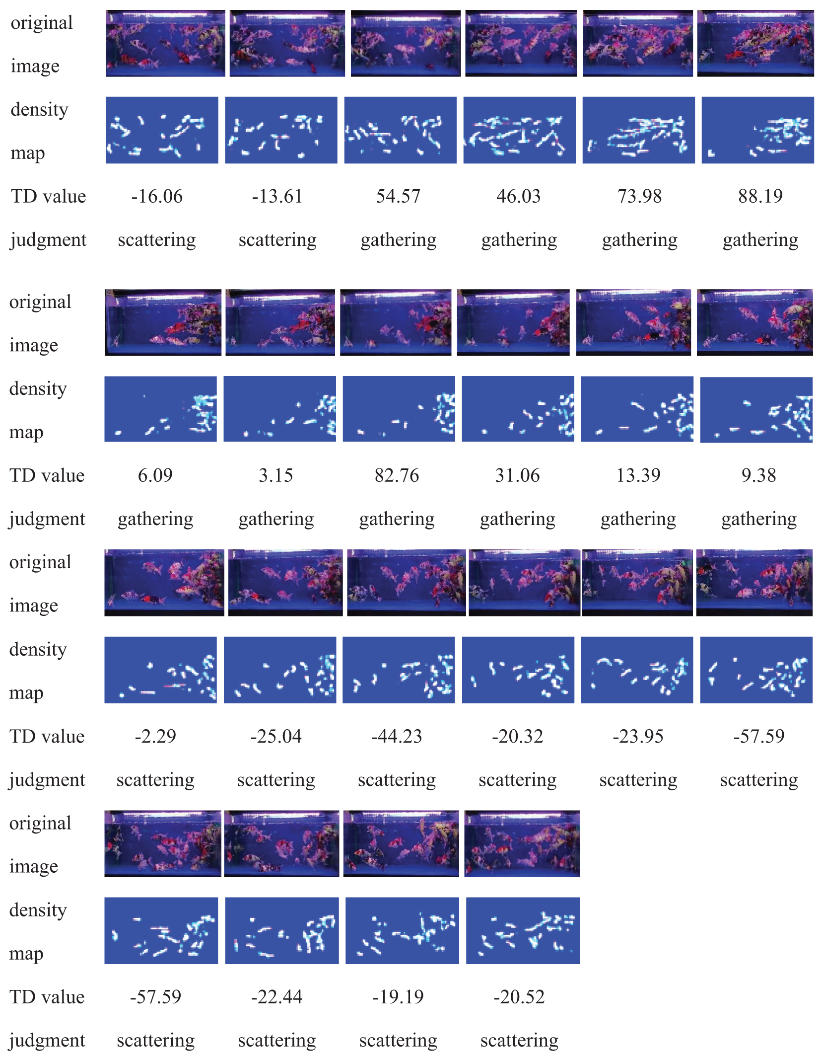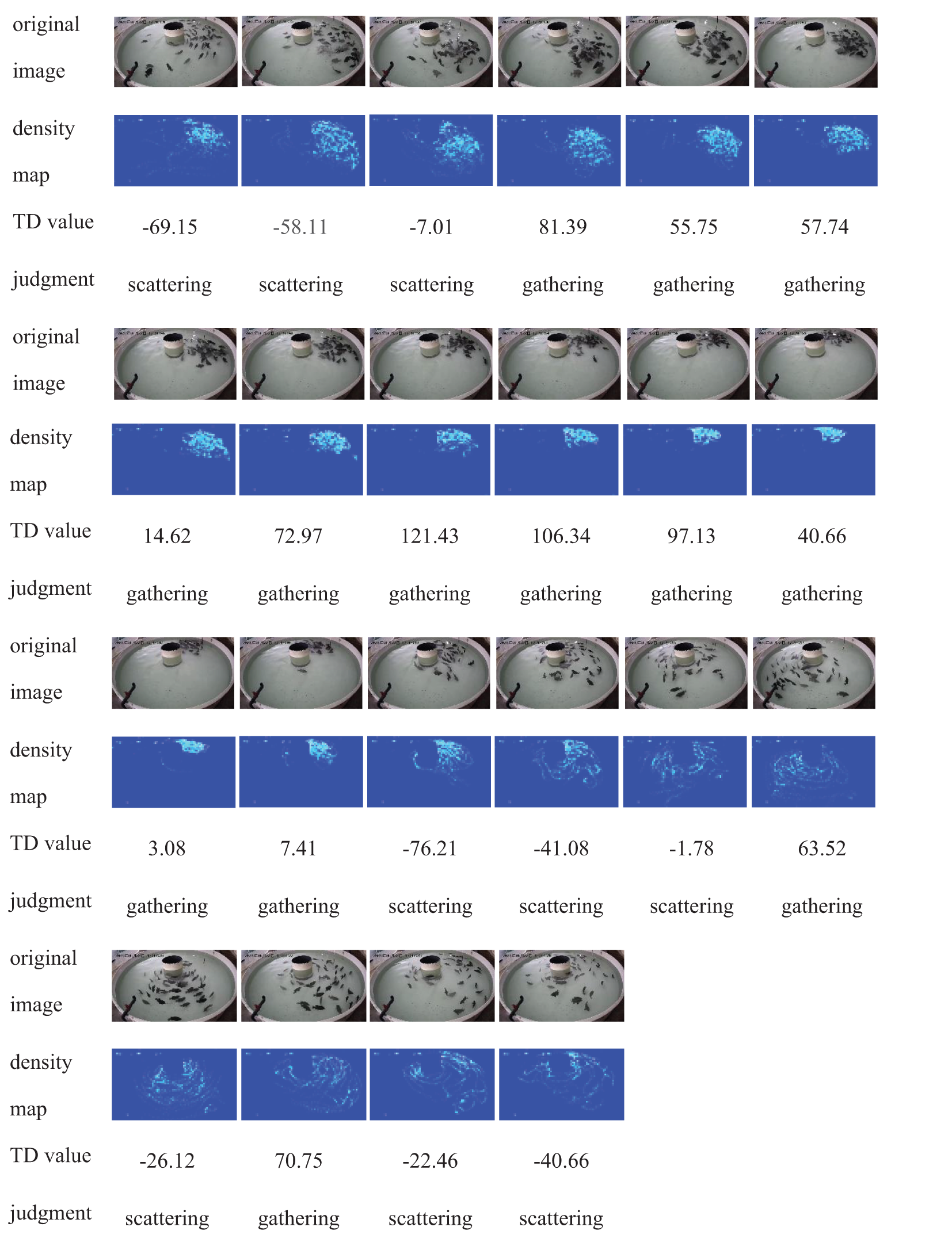 Furthermore, in the realm of intelligent aquaculture research, it is crucial to delve into fish feeding behavior for scientific assessment of hunger levels and optimization of aquaculture practices. The behavior patterns of fish school are complex and changeable, including group behavior, domain behavior, courtship behavior, escape behavior and feeding behavior. These behavioral patterns are formed in the process of survival and reproduction of fish, which is a way for them to adapt to the environment. Feeding behavior serves as an indicator of a fish’s food requirements while also reflecting its degree of hunger to a significant extent. Therefore, by observing and analyzing the aggregation and dispersion patterns exhibited by schools of fish, we can gain more efficient insights into their feeding behavior. The density distribution within a school accurately depicts its level of aggregation; high density distributions indicate strong feeding behavior with intensified schooling tendencies, necessitating increased bait quantities to meet demand. Conversely, low density distributions signify scattered fish with weaker feeding behaviors, requiring reduced or suspended bait casting to avoid wastage. Scientific judgment of hunger degree and accurate feeding can optimize the breeding process and improve production efficiency, which is of great significance for realizing intelligent bait casting and improving breeding management.