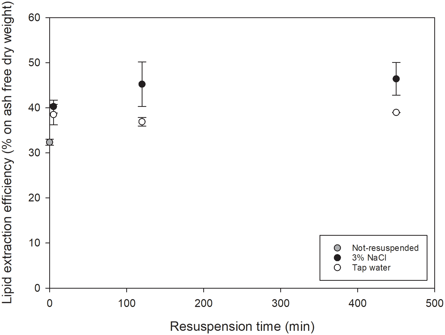 Figure 2 Lipid extraction efficiency (% on ash free dry weight) as function of resuspension time (min) for COM-FD-Nsp that was not resuspended (gray symbol), resuspended in 3% NaCl (black symbols) or resuspended in tap water (white symbols) reported as mean +/- st.dev with n=2*2 for resuspended biomass and n=4 for not-resuspended biomass. No significant differences (α=0.05) were observed for the effect of resuspension, nor of resuspension duration nor resuspension medium.