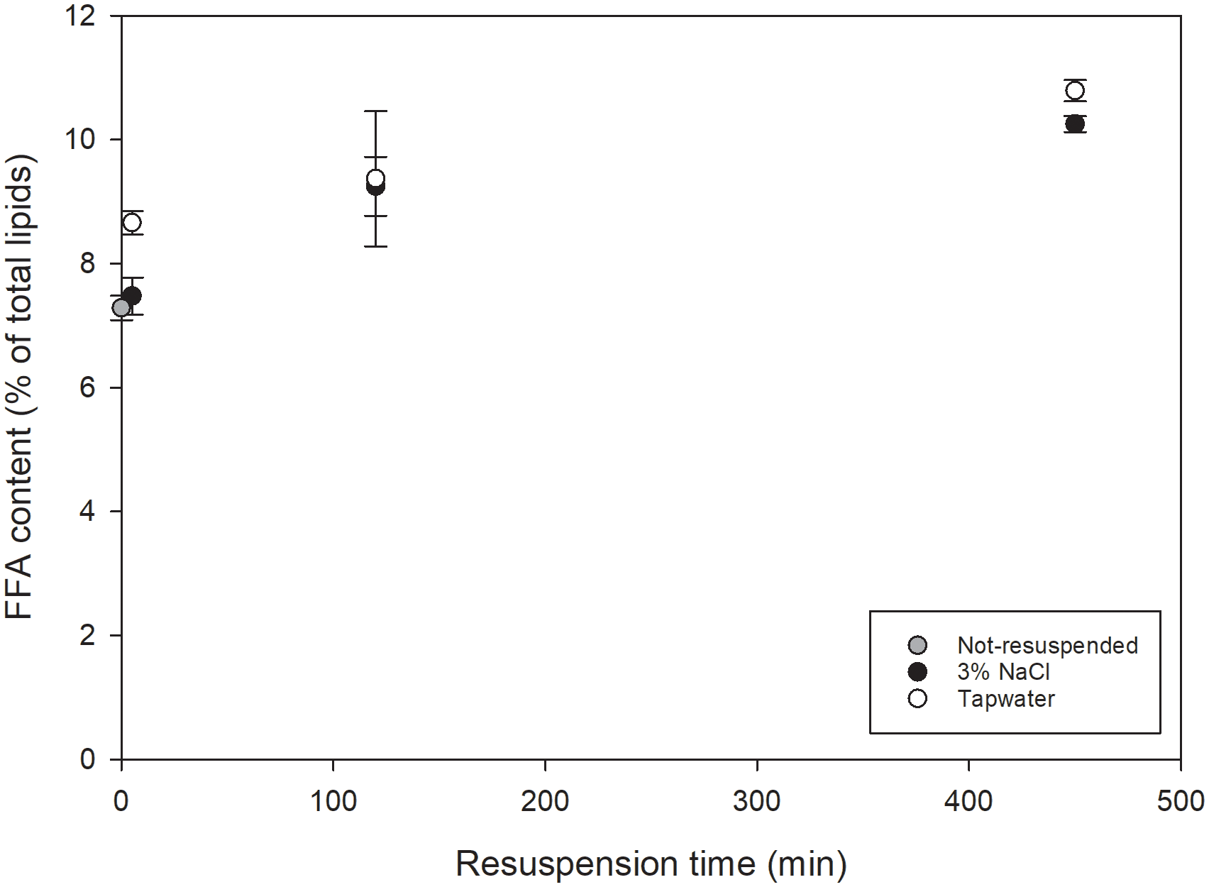 Figure 3 FFA content expressed as % of total lipids as function of resuspension time (min) for COM-FD-Nsp that was not resuspended (gray symbols), resuspended in 3% NaCl (black symbols) or resuspended in tap water (white symbols) reported as mean +/- st.dev with n=2*2 for resuspended biomass and n=4 for not-resuspended biomass. A significant effect of resuspension duration was observed. Neither resuspension medium nor the resuspension itself had a significant effect.