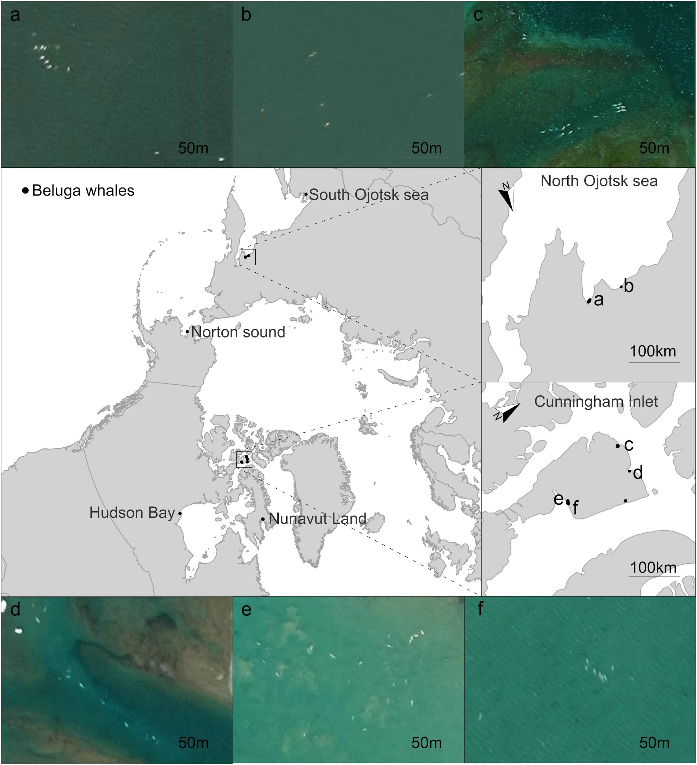 Beluga whale aggregations in the Arctic Ocean detected in very high-resolution satellite imagery from Google Earth. (A–F) beluga whale aggregations.