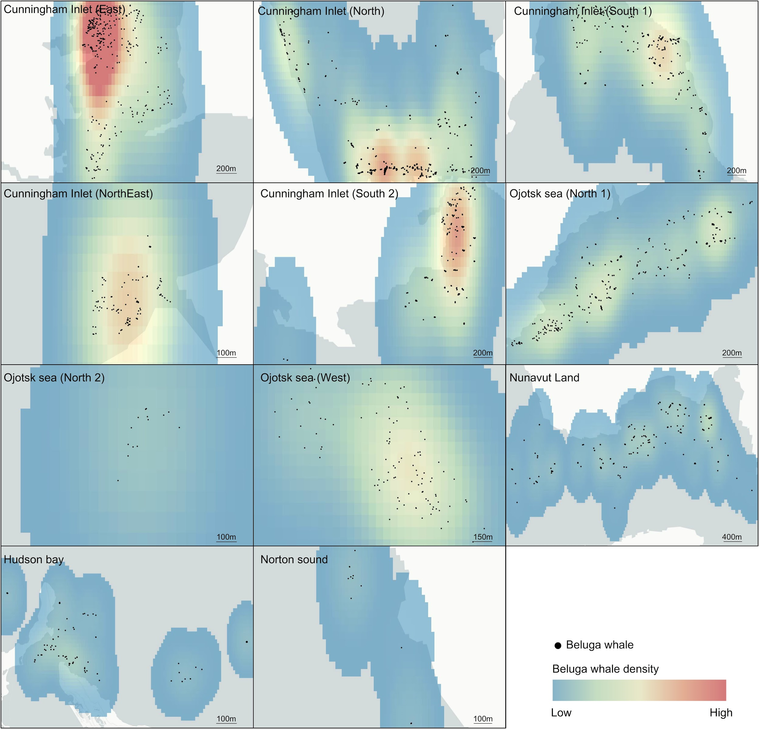Density maps of beluga whale aggregations. Red indicates high densities.
