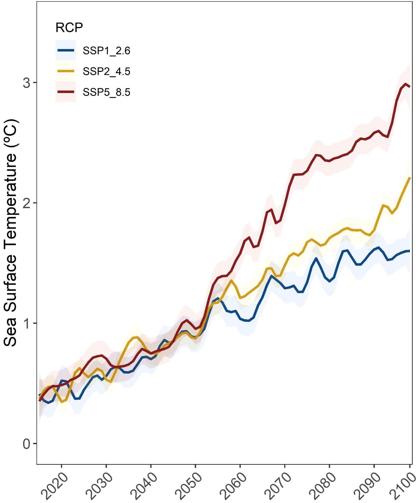 Average sea surface temperature (°C) projections under the SSP1 2.6, SSP2 4.5 and SSP5 8.5 IPCC scenarios at the 11 beluga locations analyzed herein (solid lines) with their corresponding standard errors (semi-transparent ribbons).