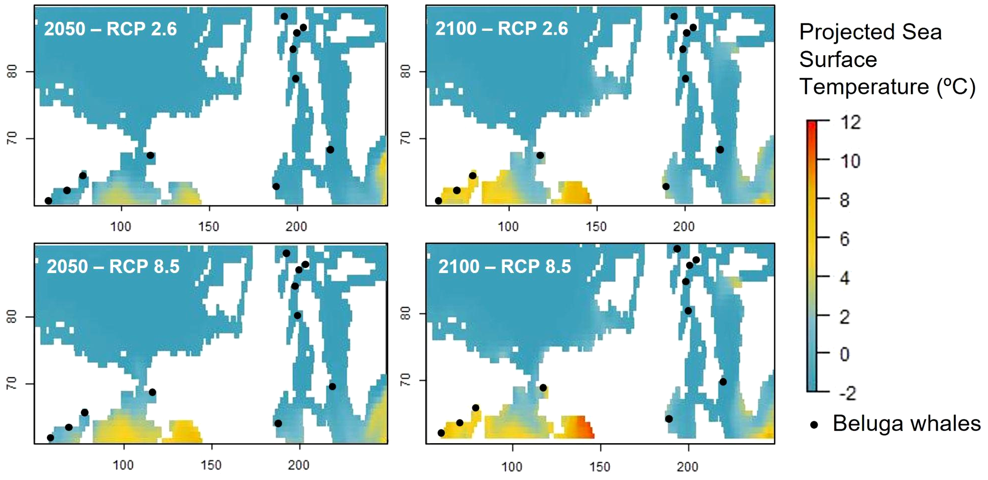 Overall, our study with a low-cost tool to monitor cetaceans using freely available satellite imagery and artificial intelligence demonstrated how beluga whales aggregate less in higher SST and how their habitats are predicted to warm throughout the 21st century. Spatial beluga whale population patterns are directly associated to sea temperature and climate change will certainly affect them in the future decades. However, the chosen IPCC greenhouse emission path will determine the extent and speed of SST increases for the rest of the century. Under this scenario, we recommend a prompt and global reduction of gas emissions and the protection of beluga whale territories from marine traffic if we wish to preserve this vulnerable species. In this regard, this study, along with future research to detect thermal shelters in the Arctic may comprise valuable tools in highlighting potential climate change impacts on beluga whale populations.