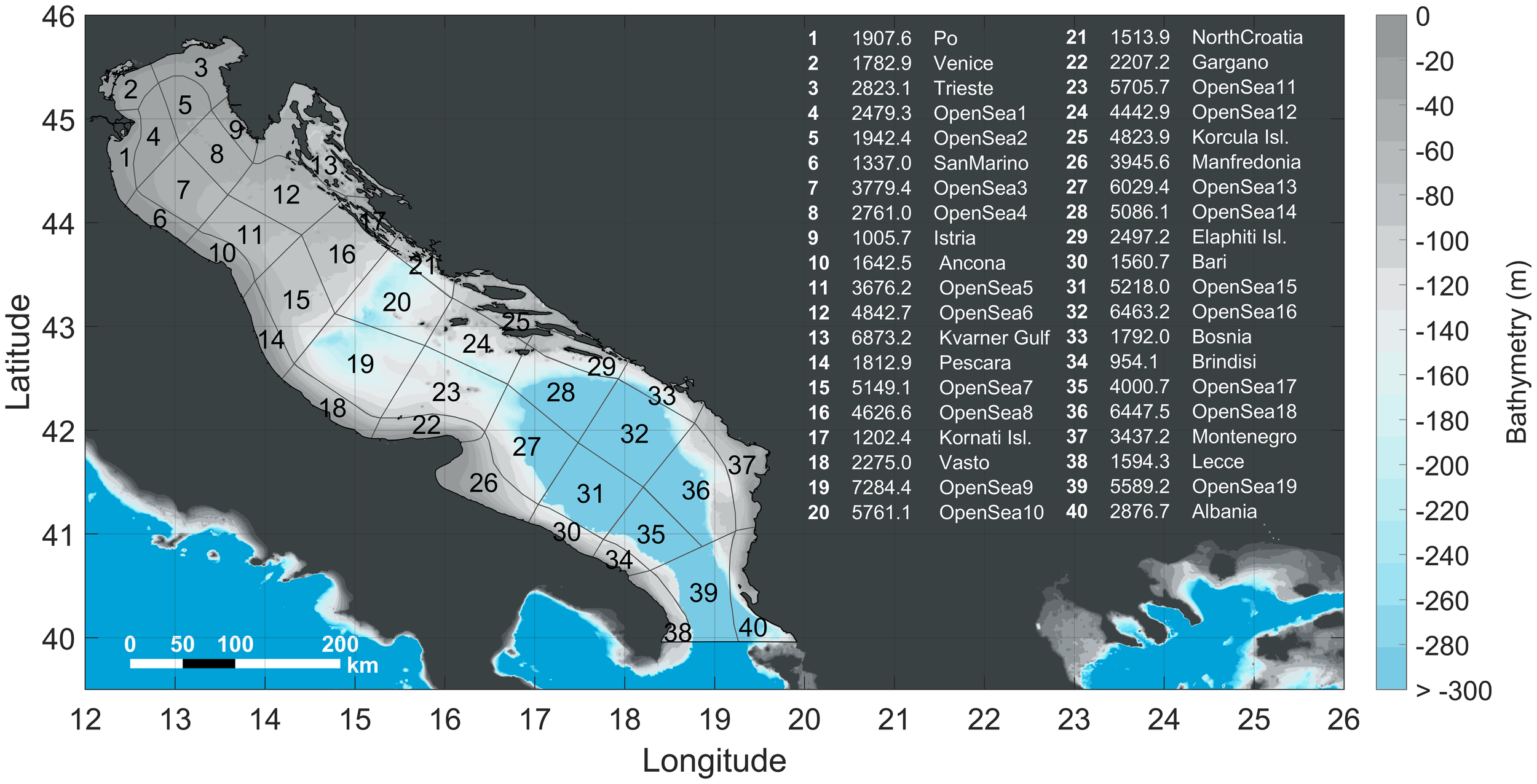 Map of the study area with the subareas of source and destination of particles and bathymetric features. A summarizing table that illustrates the code numbers, associated names and surface areas in km2 of each box is included.