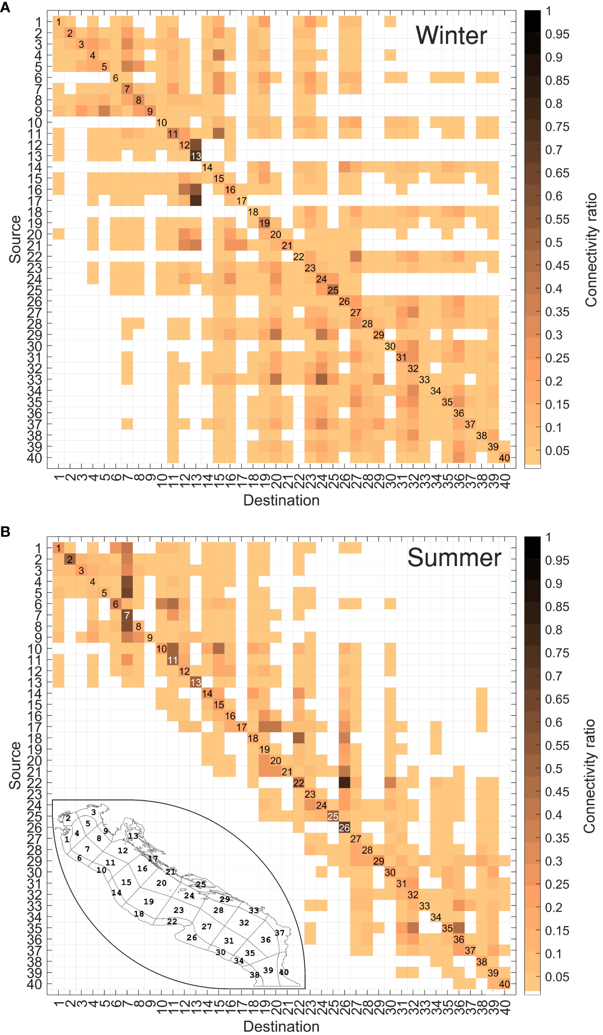 Average connectivity matrices representing the mean exchange of particles between sub-zones in winter (A) and summer (B). The color scale represents the particle concentration at the selected time scale. A small map of the study area showing the sub-areas is displayed in the summer scenario to facilitate interpretation.
