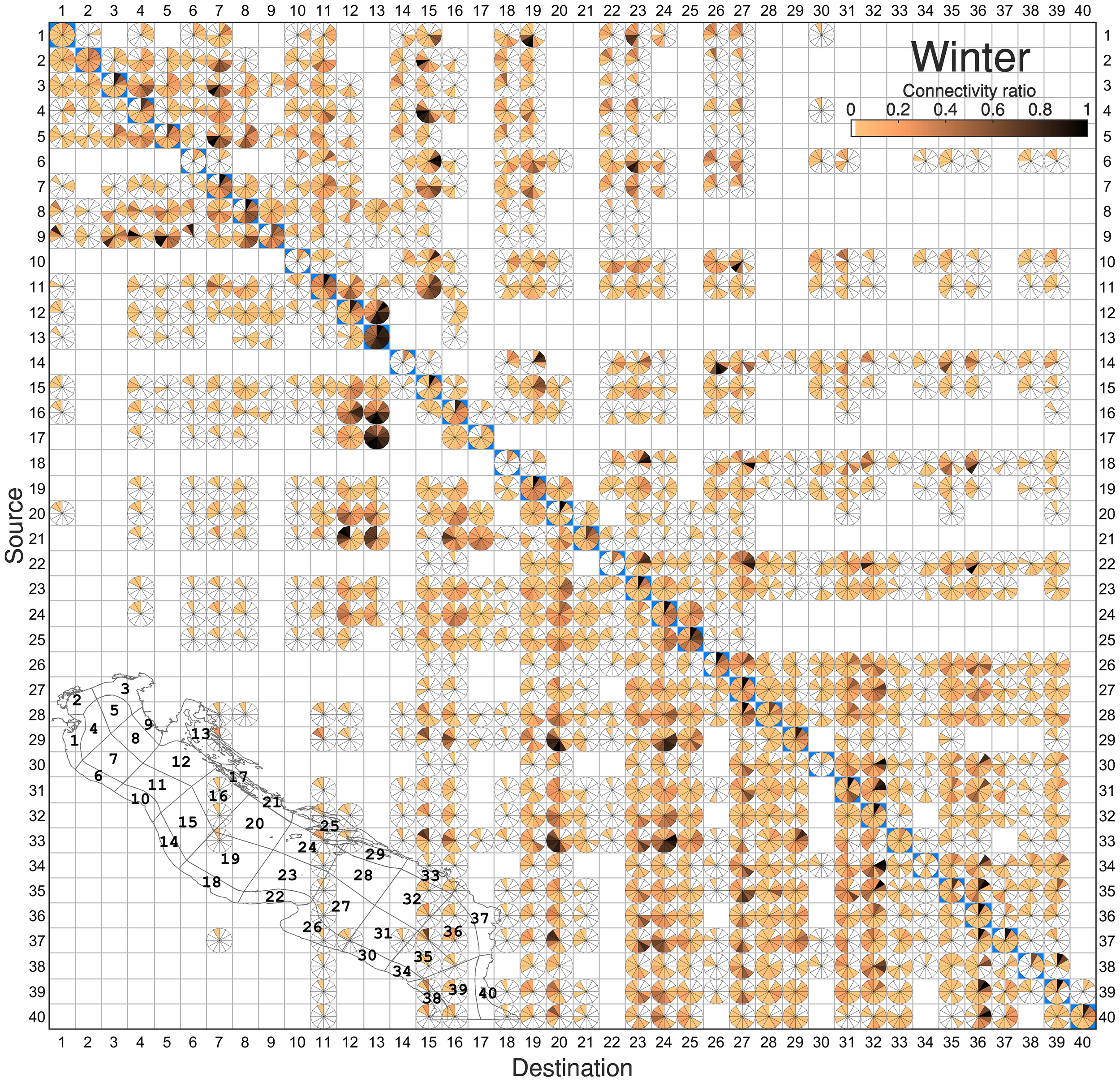 RCM representing the time-dependent exchange of particles between sub-zones in winter, with the diagonal cells highlighted in blue color. A small map of the study area showing the 40 sub-areas and their corresponding codes is displayed to facilitate the interpretation of results.