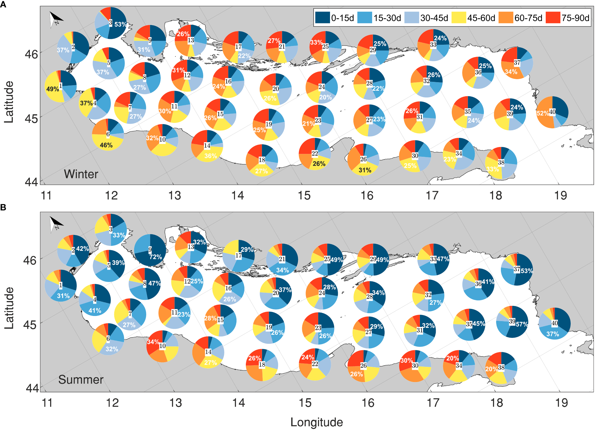 Based on the averaged result, we can derive macro-regions as combinations of boxes of our network. For instance, more evident in summer than in winter, areas 1-9 and 26-40 may be identified as two isolated regions with a slight or null inter-connection. A third area can be identified in 10-25 (central Adriatic), where the particle reception is mainly limited to the upper part of the connectivity matrix (northern and central Adriatic), with limited or no exchange with the southern sub-basin during summer. During winter, the prevailing currents over the AS inject more energy in the basin, leading to a wider dispersion of particles and a less distinct delineation of macro-regions. The seasonality is also evident by the significantly higher number of valid elements, i.e., cells with connectivity probabilities higher than 1%, in winter (~900 out of 1600, Figure 5A) compared to summer (~600 out of 1600, Figure 5B). The likely reason is the atmospheric forcing, which is less variable and more stable in summer, resulting in diminished velocities and consequently shorter drifter paths in this period. The much more dispersed transport because of the more variable atmospheric forcing during winter may create otherwise less structured connectivity patterns within the basin.