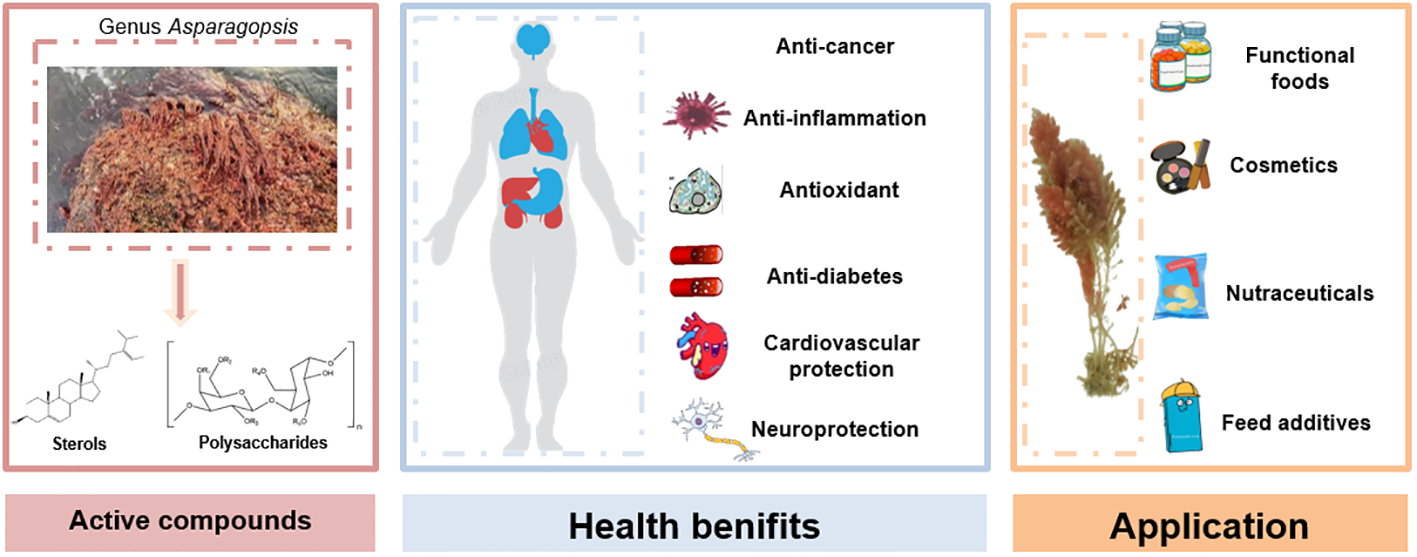 In the contemporary age, the exploration of natural compounds derived from marine algae has gained paramount importance owing to the progressively recognized untapped potential they encompass across a spectrum of sectors. Using the genus Asparagopsis as an illustrative instance, marine algae, known for their extensive diversity and distinctive biochemical composition, offer a myriad of bioactive molecules with significant potential to tackle modern challenges. Amid the world’s grappling with mounting concerns like chronic ailments, antibiotic resistance, environmental degradation, and the imperative for sustainable resources, marine algae stand out as a valuable repository of innovative solutions (Fernando et al., 2016; Carreira-Casais et al., 2021; Yao et al., 2022). In recent times, the role of an unhealthy diet in contributing substantially to a wide range of afflictions, spanning both physical and metabolic disorders, has come into prominence. Contemporary dietary trends characterized by excessive consumption of processed edibles, sugary drinks, saturated fats, and refined carbohydrates have led to a disconcerting surge in obesity, cardiovascular illnesses, type 2 diabetes, and various chronic afflictions (DeFronzo et al., 2015; Furman et al., 2019). Such eating habits frequently lack essential nutrients and dietary fiber, undermining overall well-being and diminishing the immune system’s robustness (Pahwa and Sharan, 2022; Qiu et al., 2022). In this context, the importance of incorporating marine seaweed into our diets has captured attention as a potential remedy. These nutrient-abundant marine plants not only have low caloric content but are also enriched with essential nutrients and dietary fiber (Lopez-Santamarina et al., 2020). By harnessing the potential of natural compounds sourced from marine algae, researchers and industries are not solely opening doors to pioneering breakthroughs but also pushing the frontiers of science, sustainability, and human well-being.