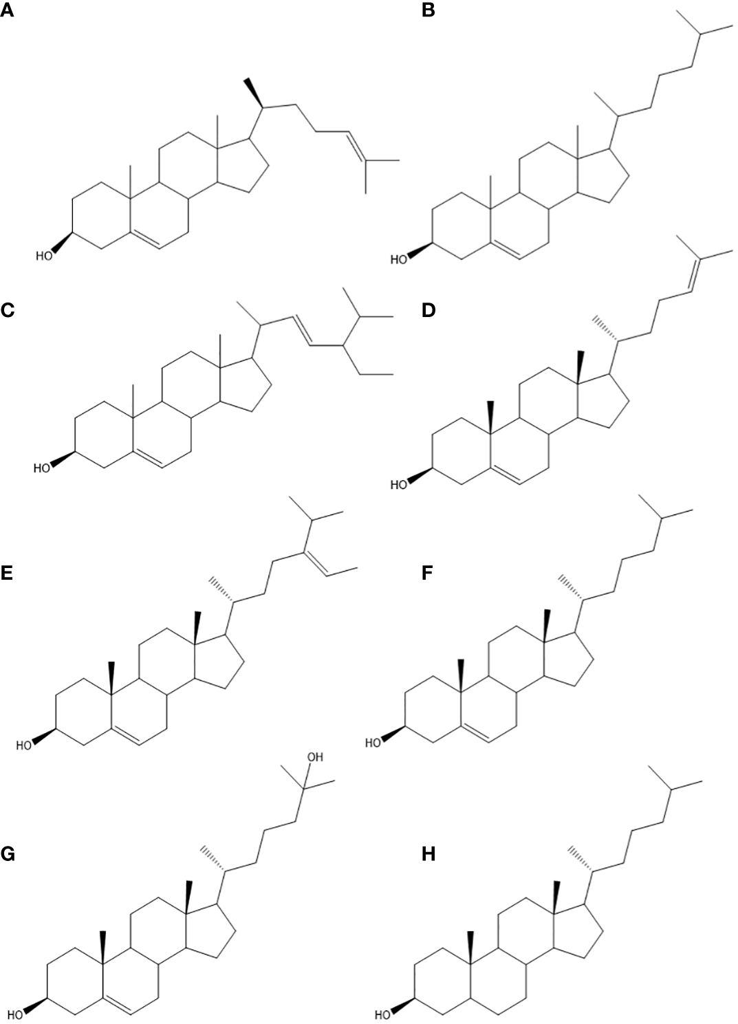 Structural formula for sterols. Desmosterol (A), cholesterol (B), stigmasterol (C), 25-hydroxy-24-methylcholesterol (D), avenasterol (E), 22-dehydrocholesterol (F), 25-hydroxy cholesterol (G), and cholestanol (H).