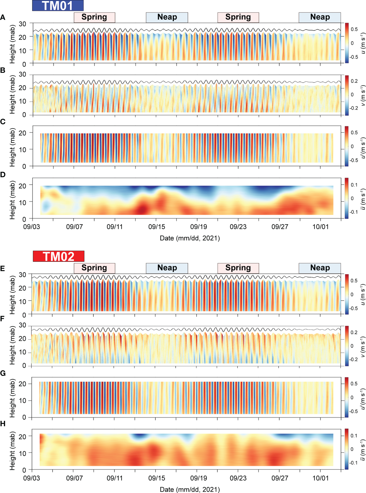 Time series of (A, E) along-channel current velocity (u), (B, F) across-channel velocity (v), (C, G) tidal current velocity (u′), and (D, H) residual current velocity () at TM01 and TM02 stations, respectively.