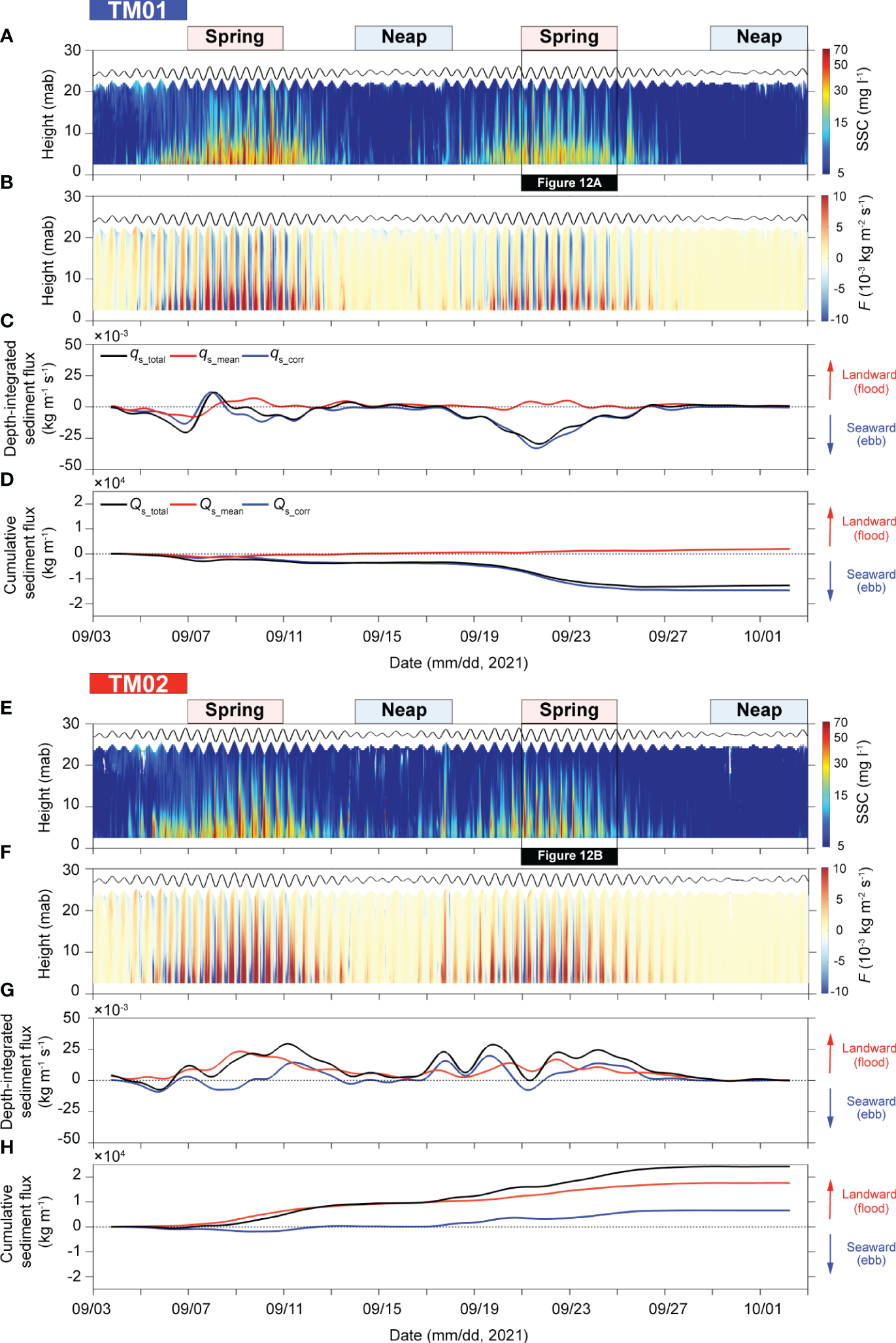 Time series of (A, E) the SSC profiles, (B, F) instantaneous sediment fluxes, (C, G) the depth-integrated along-channel sediment fluxes, and (D, H) cumulative along-channel sediment fluxes. Positive and negative symbols indicate the landward and seaward directions, respectively.