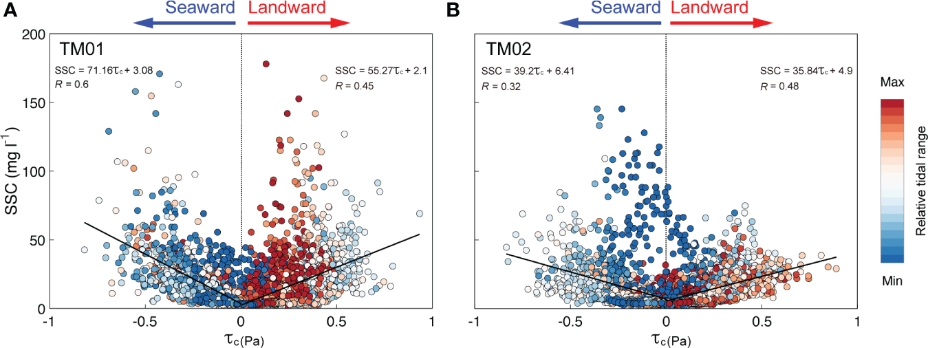 The sediment resuspension at both stations occurred frequently in response to τc (Figure 8). As the tidal forcing was applied equally to the water column at TM01 and TM02, the sediments resuspended from the bed were transported landward or seaward with the tidal cycles. On the other hand, the timing of the maximum τc and SSC at two stations varied with the tidal cycles, resulting in different resuspension patterns. When the same τc was applied to the bed, the sediment at TM01 was resuspended more easily than at TM02. At TM01, the high SSC (up to 170 mg l–1) occurred when τc was intensified above approximately 0.25 Pa, and low SSC occurred predominantly shortly after slack water (Figure 8A). The SSC increased readily at lower τc during ebb rather than flood. The high SSC that occurred during the decelerating flood could be due to the sediment settling. On the other hand, the SSC at TM02 was not easily resuspended, even at a stronger τc than that at TM01 (Figure 8B). The maximum SSC was observed during the low tides after the peak ebb velocities. The SSC increased to 145 mg l–1 despite the low τc during low tides and even when τc was close to 0 Pa, the SSC was > 80 mg l–1. During low tides, the SSC at TM02 was maintained mostly at > 80 mg l–1, probably advection or settling of sediments.