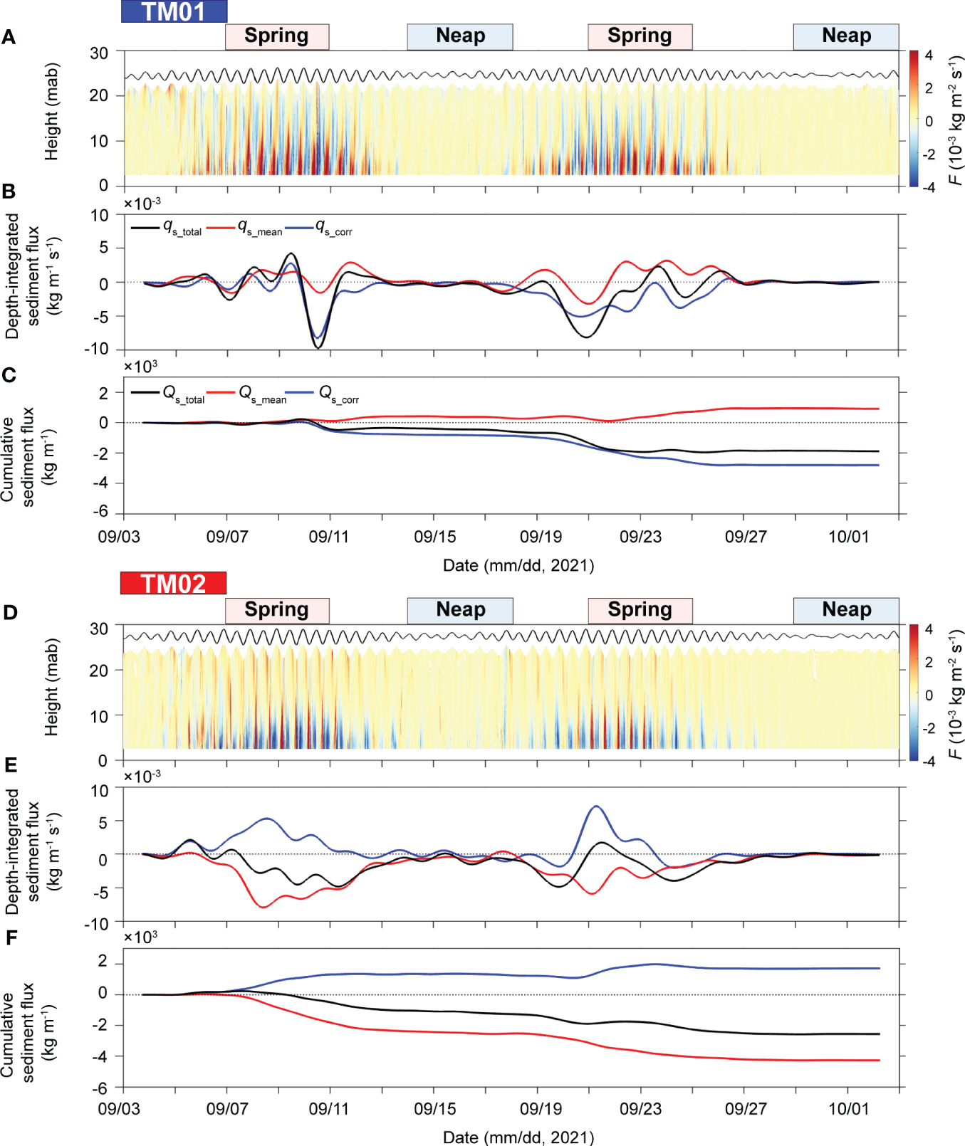 The instantaneous across-channel sediment fluxes were generally lower than the along-channel fluxes, which are consistent with the weaker across- than the along-channel current velocities (Figures 9A, D). At TM01, the suspended sediment in the lower layer was transported eastward and westward during flood and ebb, respectively (Figure 9A). At TM02, the suspended sediment in the lower layer was transported westward during flood and the accelerating ebb. In contrast, suspended sediment was transported eastward during the decelerating ebb (Figure 9D). Depth-integrated across-channel sediment fluxes (qs_total) were dominant during spring tides, showing different patterns at TM01 and TM02 (Figures 9B, E). Similar to along-channel fluxes, the across-channel fluxes (Qs_total) during the entire observation periods at TM01 were dominated by Qs_corr (75% of the total) and were transported westward (negative) (Figure 9C). At TM02, it was dominated by Qs_mean (63% of the total) and was transported westward (negative) (Figure 9F). At two stations, Qs_total was transported westward at ~0.06 ton m–1 day–1 and ~0.09 ton m–1 day–1 at TM01 and TM02, respectively.