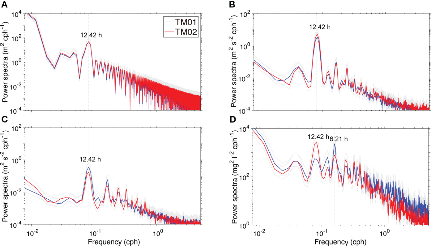 Power spectra of (A) water level, (B) along-channel velocity (u), (C) across-channel velocity (v), and (D) SSC. The gray lines indicate a confidence interval of 95%. The vertical dashed lines indicate frequencies of semi-diurnal (12.42 h) and quarter-diurnal (6.21 h).