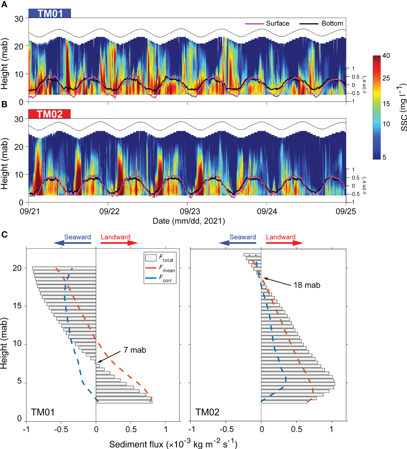 SSC and u (magenta: surface current velocity, black: bottom current velocity) during the second spring tide at (A) TM01 and (B) TM02, respectively. (C) Tide-averaged suspended sediment flux (Ftotal). The red and blue dashed lines indicate the advective flux (Fmean) and tidal pumping flux (Fcorr), respectively.