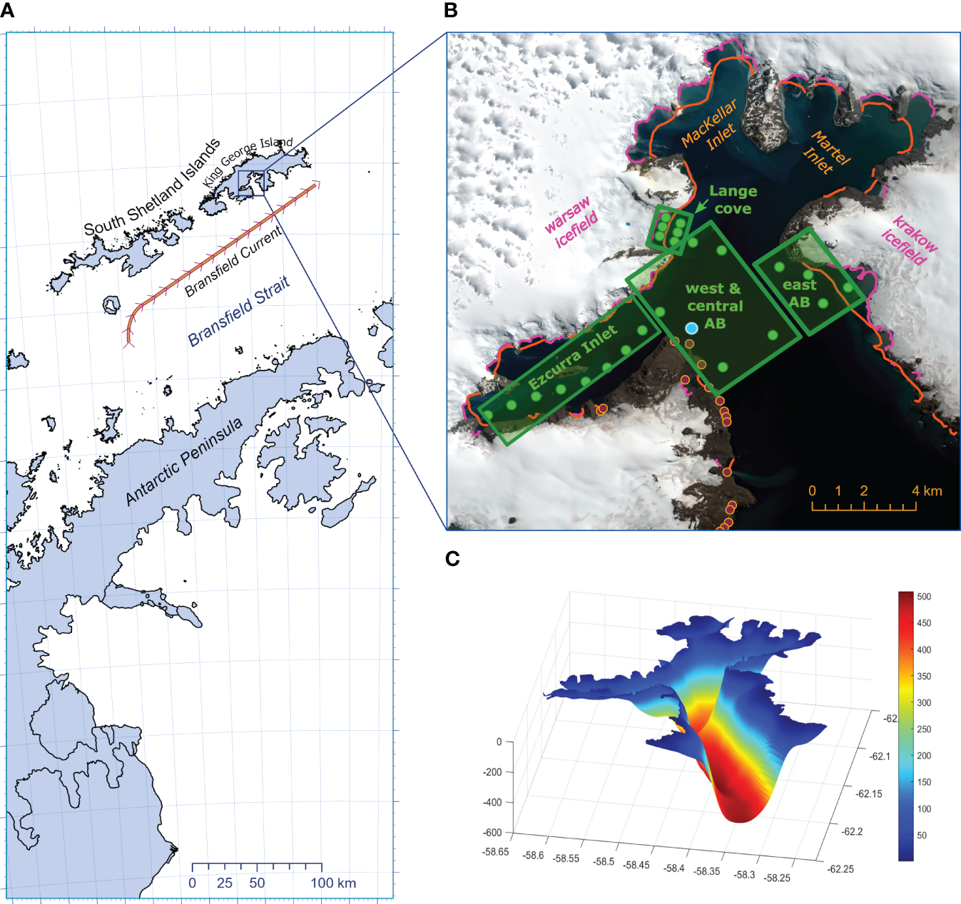 AB has an area of 150 km2 and has been previously described as a wide fjord, however, geomorphologically, it is a tectonic estuary (Valle-Levinson, 2010), formed by geological faults (Majdański et al., 2008), which explains its distinction from northern hemisphere fjords. For the purposes of this study, a new, hitherto most precise bathymetric map of AB has been created, compiling data from Battke (1990), Majdański et al. (2008); Magrani et al. (2016) and self-conducted ADCP measurements (Figure 1C). It shows that AB’s mean depth is 160 m, but in its central part there is a relatively narrow trough up to 600 m deep. AB is connected with Bransfield Strait through a 8 km wide opening, notably, without a well-defined sill.
