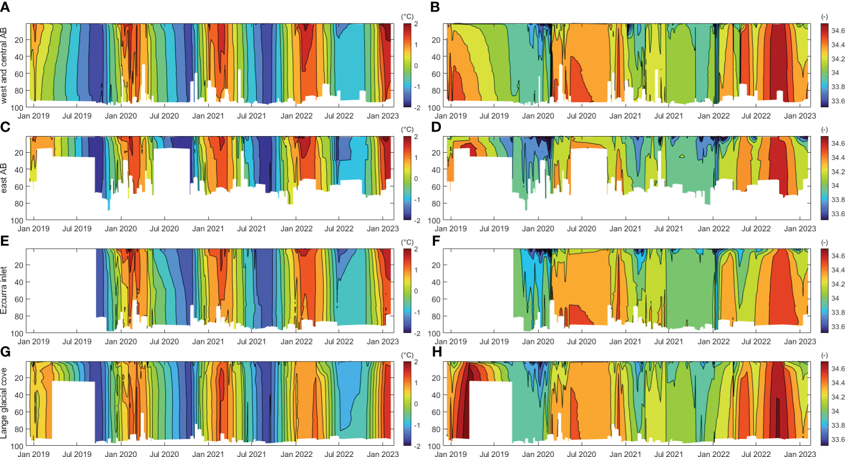 Overview of salinity and temperature records in AB. (A, C, E, G) mean temperature (°C) and (B, D, F, H) mean salinity in four zones: (A, B) – west and central AB, (C, D) east AB, (E, F) Ezcurra inlet, (G, H) Lange cove.