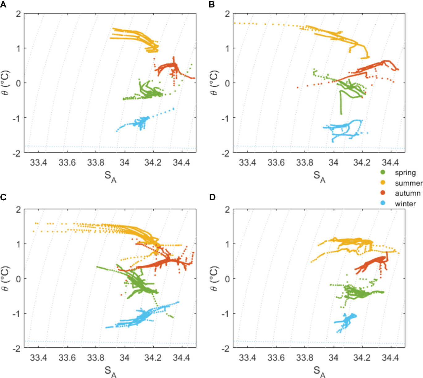 TS diagrams, as shown in Figure 3, are used to differentiate between water masses inside of the AB. AB waters during the winter are generally homogenous, with temperature and salinity marginally rising as depth increases. During the spring season, a fresher and warmer layer of water is formed on the surface, overlaying waters characterized by increasing salinity and temperature with depth. Two layers in the AB water column are also present during summer and autumn. The summer surface layer experiences maximum freshening (average salinity dropping to 33.2) and warming (mean temperature ranging from 1 to 1.5°C). During the autumn, the upper layer, in comparison to the summer season, exhibits lower temperatures and higher salinity.