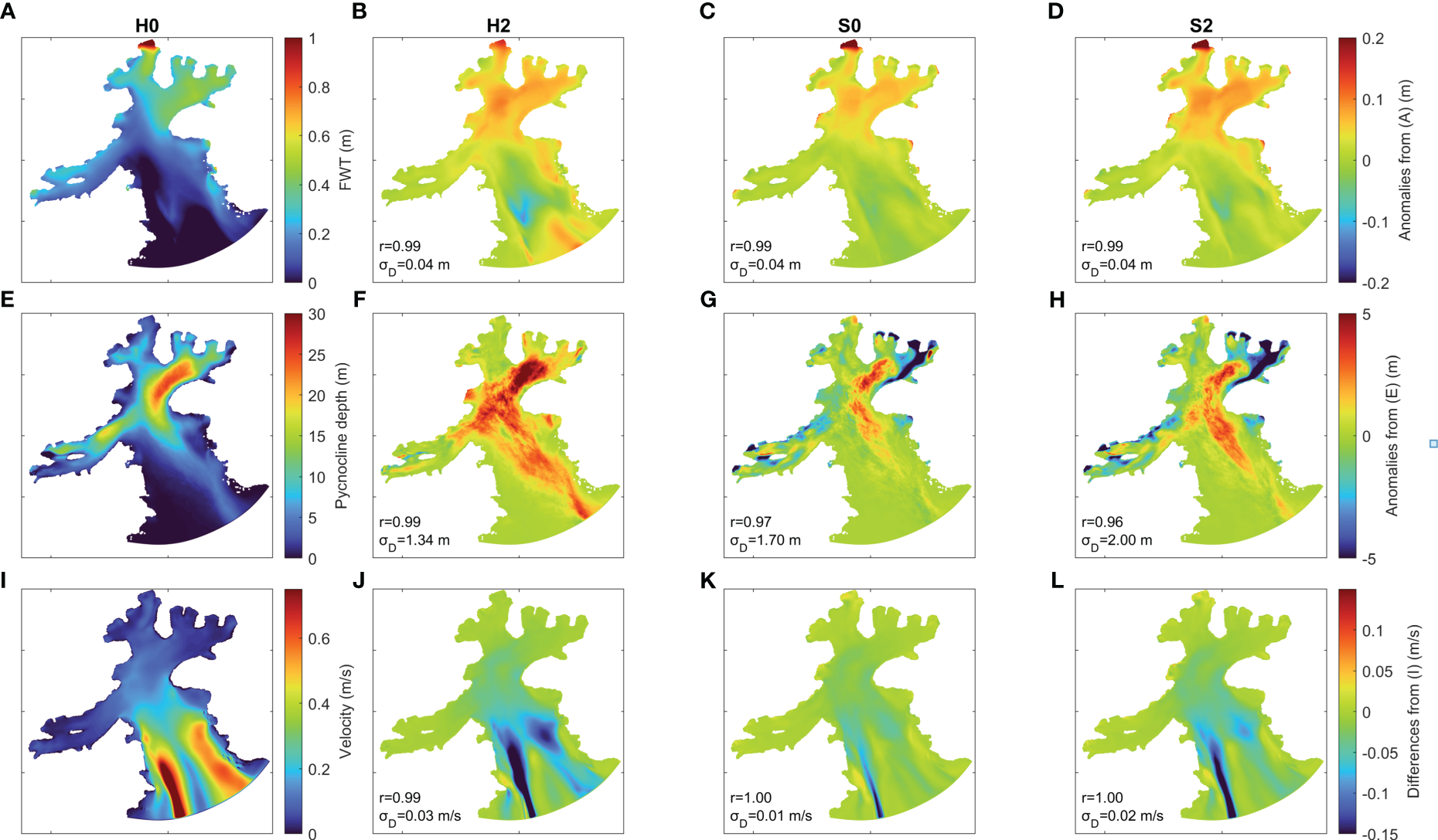 All test run results show consistent patterns in the FWT, pycnocline depth, and flow velocity values distributions across the AB Supplementary Figure 3). On the other hand, discrepancies are visible when comparing maps of differences between test runs and the reference case (H0) results (Figure 5).