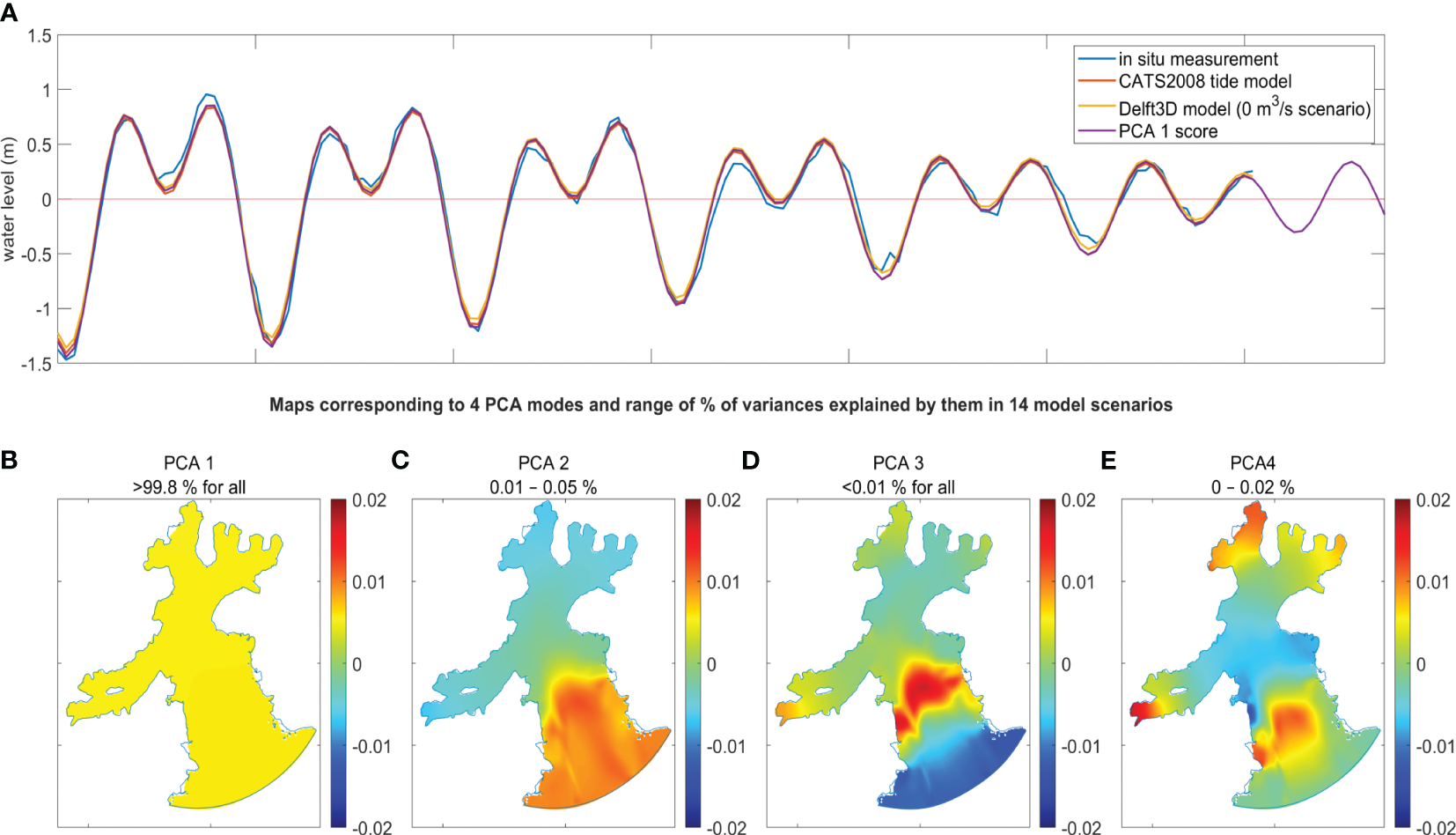 Results of PCA analysis of water level changes in 14 scenarios. (A) comparison of in situ water level measurements, CATS2008 tide model input data, Delft3D 0 m3/s model results and normalized PCA1 score (note that score values are non-dimensional, they have been divided by its double standard deviation to fit); (B–E) maps corresponding to first four principal components of water level 0 m3/s scenario (-); the percentages of water level variance explained by each mode in fourteen scenarios are shown above each map.