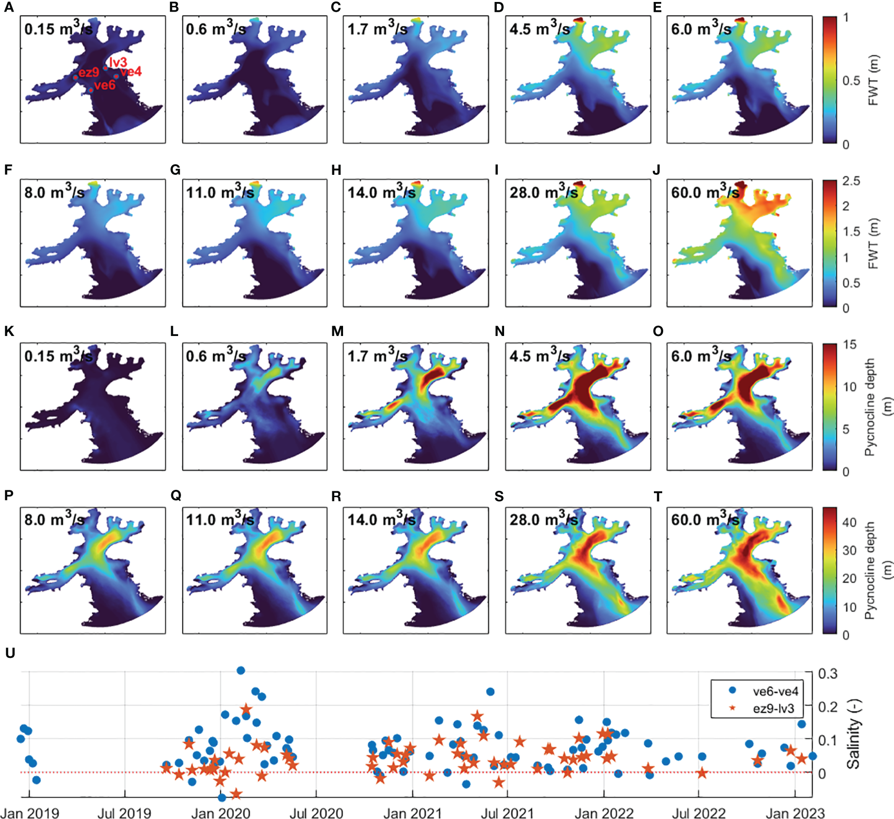 Variability of FWT and pycnocline depth with increasing glacial input; (A–J) FWT; (K–T) pycnocline depth. Note changing scales in different rows; (U) difference in average salinity readings from top 60 m of inflow (ve6 and ez9) and outflow (ve4 and lv3) sites [sites’ locations seen in (A)] Values in (A–T) are average for the period 1.01.2022-28.01.2022.