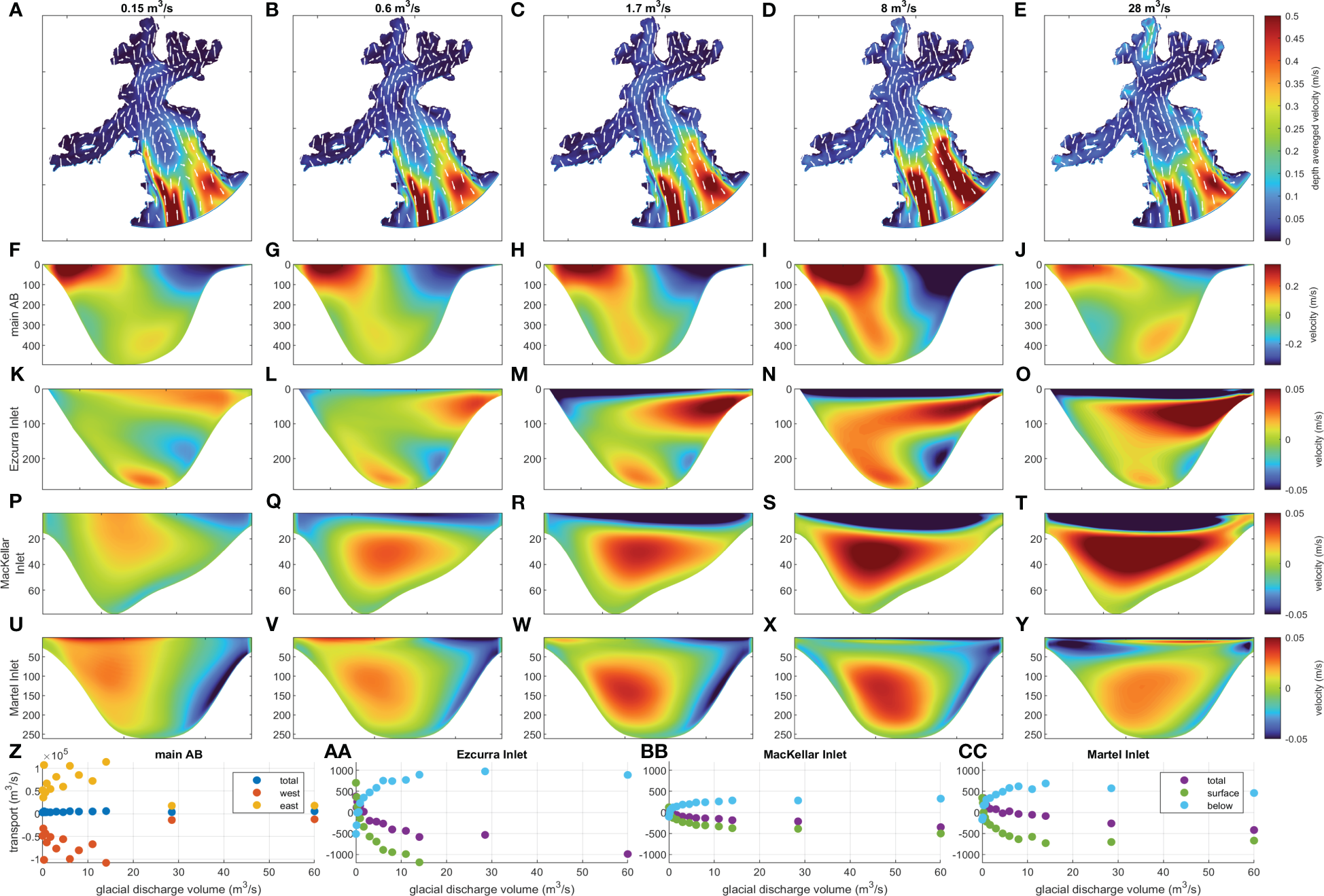 In all the model scenarios, the circulation pattern of two cyclonic circulation cells is preserved in AB (Figures 9A–E). The analysis of flow velocities and transport volumes across the main AB cross-section reveals that in scenarios ranging from 0 to 14 m3/s, the water exchange is consistently strongest near the surface and has a volume of ~105 m3/s for both inflow and outflow (Figures 9F–J, and Figure 9Z, analogous to Figures 7B, F). However, in two highest glacial influx scenarios (28 and 60 m3/s), the water transport on both sides of the main AB cross-section decreases significantly to ~104 m3/s (Figure 9Z). Similarly, in these scenarios, the flow velocities are reduced (see Figures 9E, J). This observation suggests that a threshold value of glacial inflow volume exists limiting water interchange between the bay and the ocean. Specifically this threshold is observed to be between 14 and 28 m3/s ~1 km of glacial front, which adds up to 450 and 900 m3/s of overall freshwater input into AB.