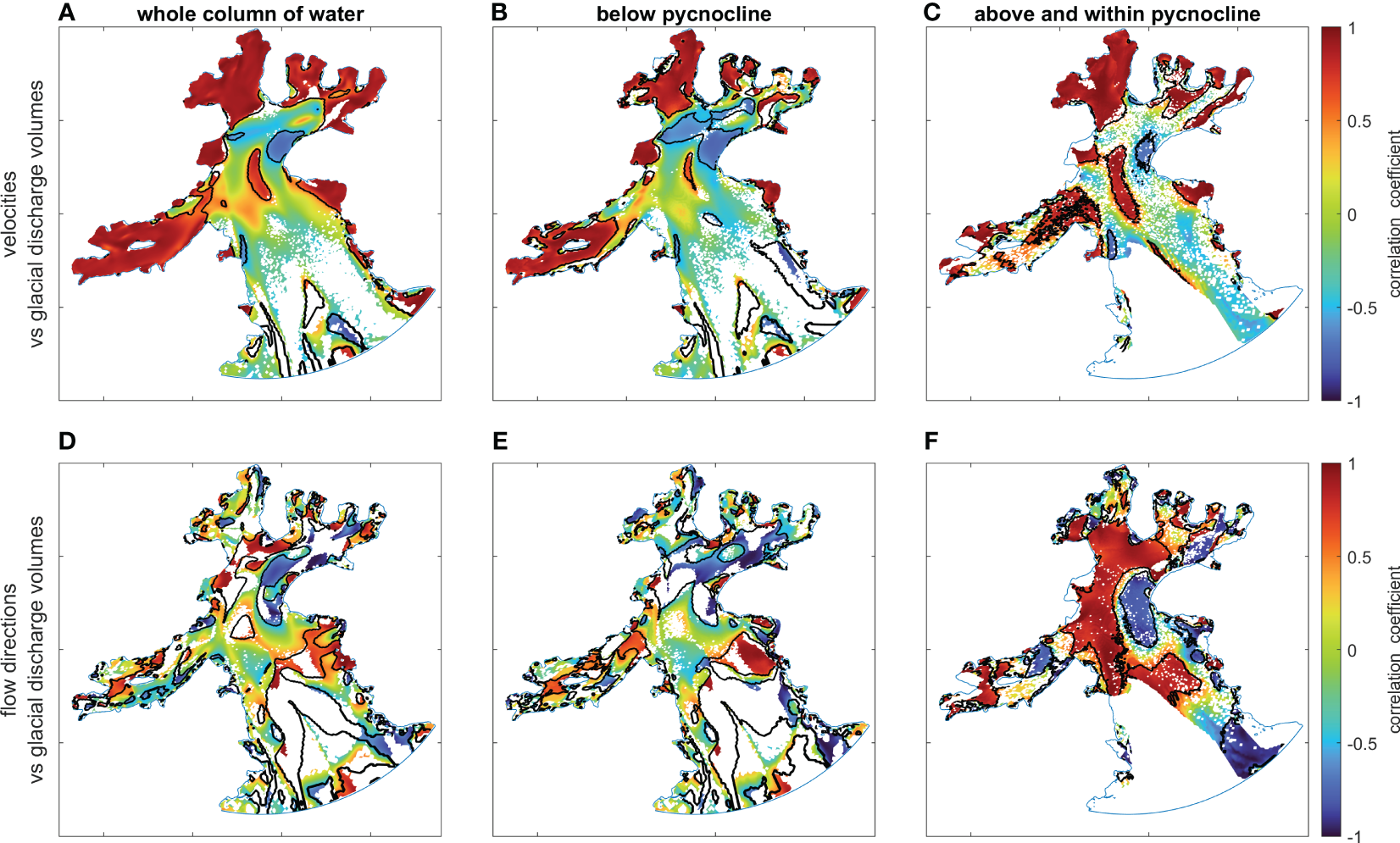 Maps depicting the correlation coefficients between the glacial influx volumes and horizontal flow velocities and directions have been generated (Figure 10). They show areas in which glacial bay buoyancy-driven vertical circulation can be a dominant flow pattern. The maps are shown in three versions: for the entire water column, for depths below the pycnocline, and for surface waters inside and above the pycnocline. In regions where pycnocline was not present, the entire column of water was treated as waters below the pycnocline. In order to acquire representative description of changes in waters above pycnocline (Figures 10C, F), correlations have been calculated for points in which pycnocline was present in at least six model scenarios. To reduce the possible influence of outliers and increase the robustness of the results, a bootstrap resampling of the data was performed (Trauth, 2010). The areas outlined with black borders in all of the maps in Figure 10 represent points where this analysis produced statistically significant results.