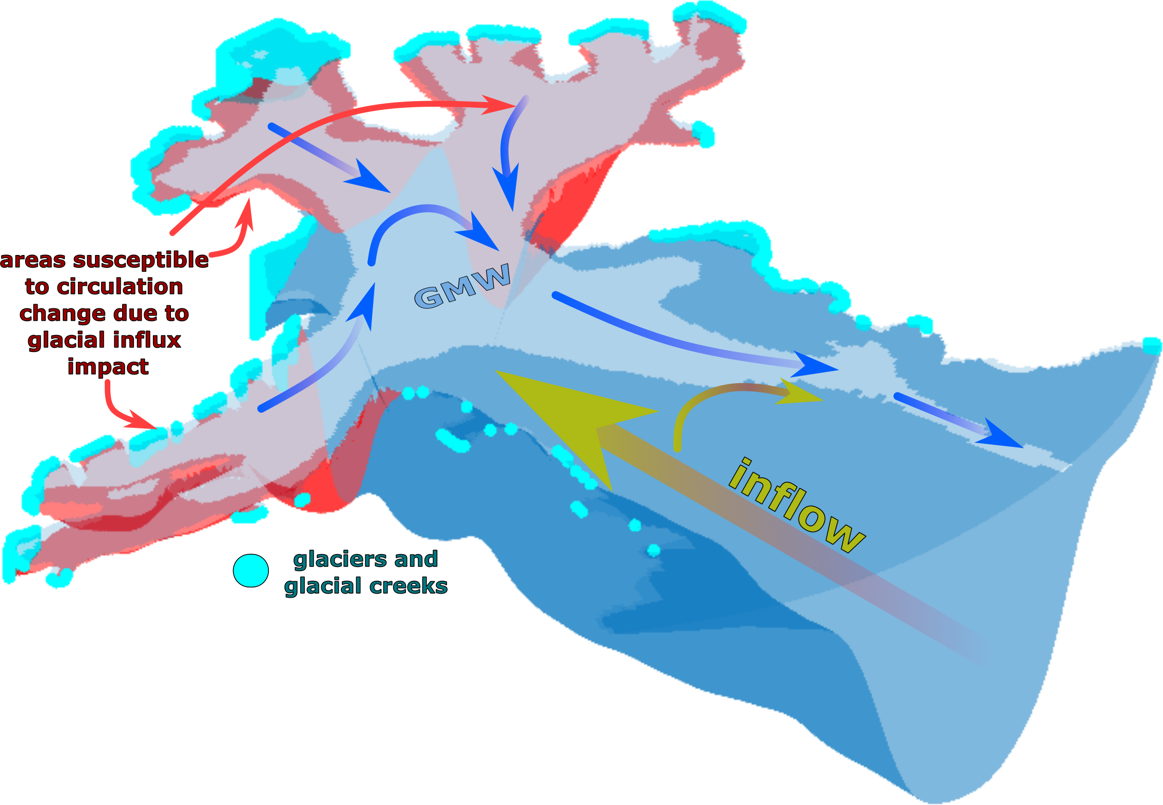 The presence of a two-layered stratification in AB, where the surface layer consists of the most buoyant layer of glacial meltwater (GMW), is reminiscent of the conditions outlined in the small-fjord single-cell circulation model proposed by (Motyka et al., 2003). However, due to the “broad” character of the bay, the AB model must be three-dimensional.