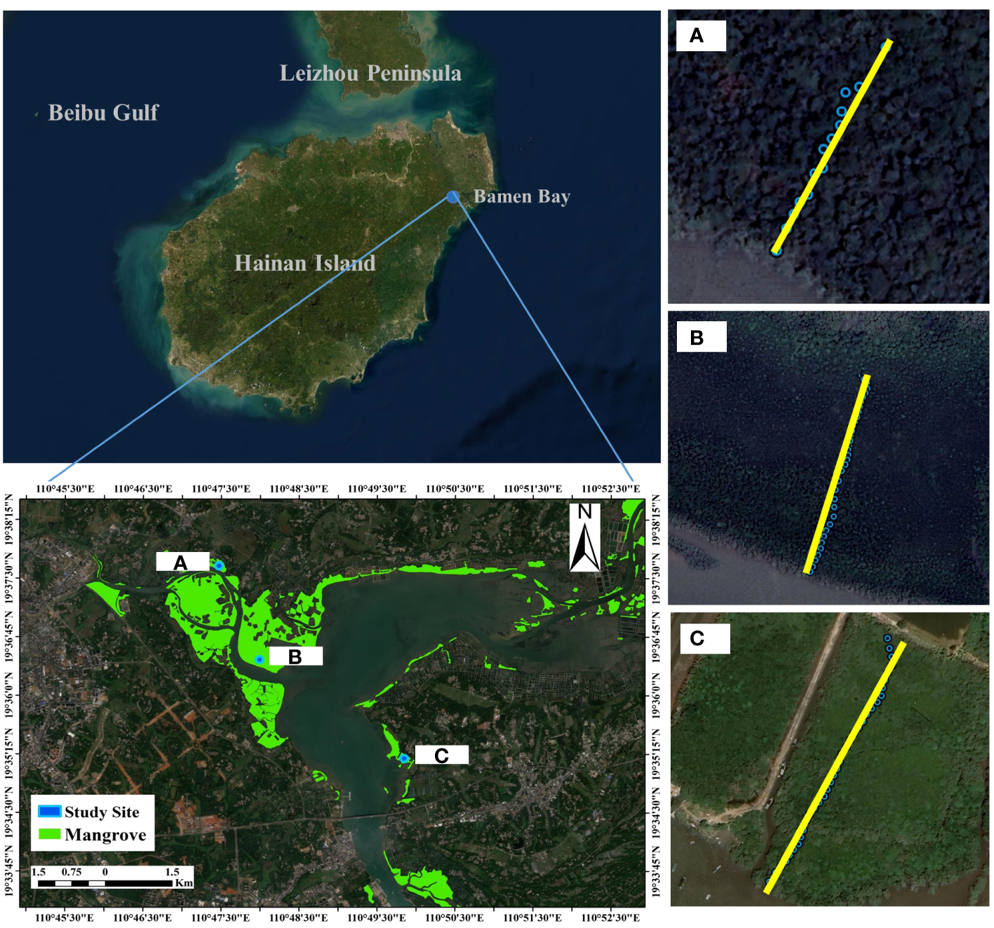 Study sites and mangrove vegetation attributes in Bamen bay, Hainan Island, China. The study site includes 3 transects (A-C). Each transect is vertical from the seaward forest edge to the landward forest edge.