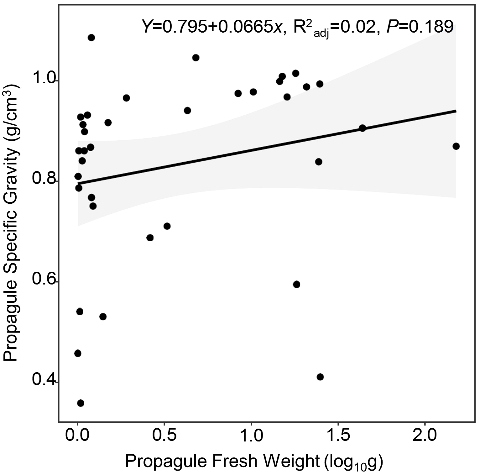 Relationship between fresh weight and static specific gravity of the propagules of 35 mangrove species (25 true mangrove species and 10 mangrove associates, p=0.189).