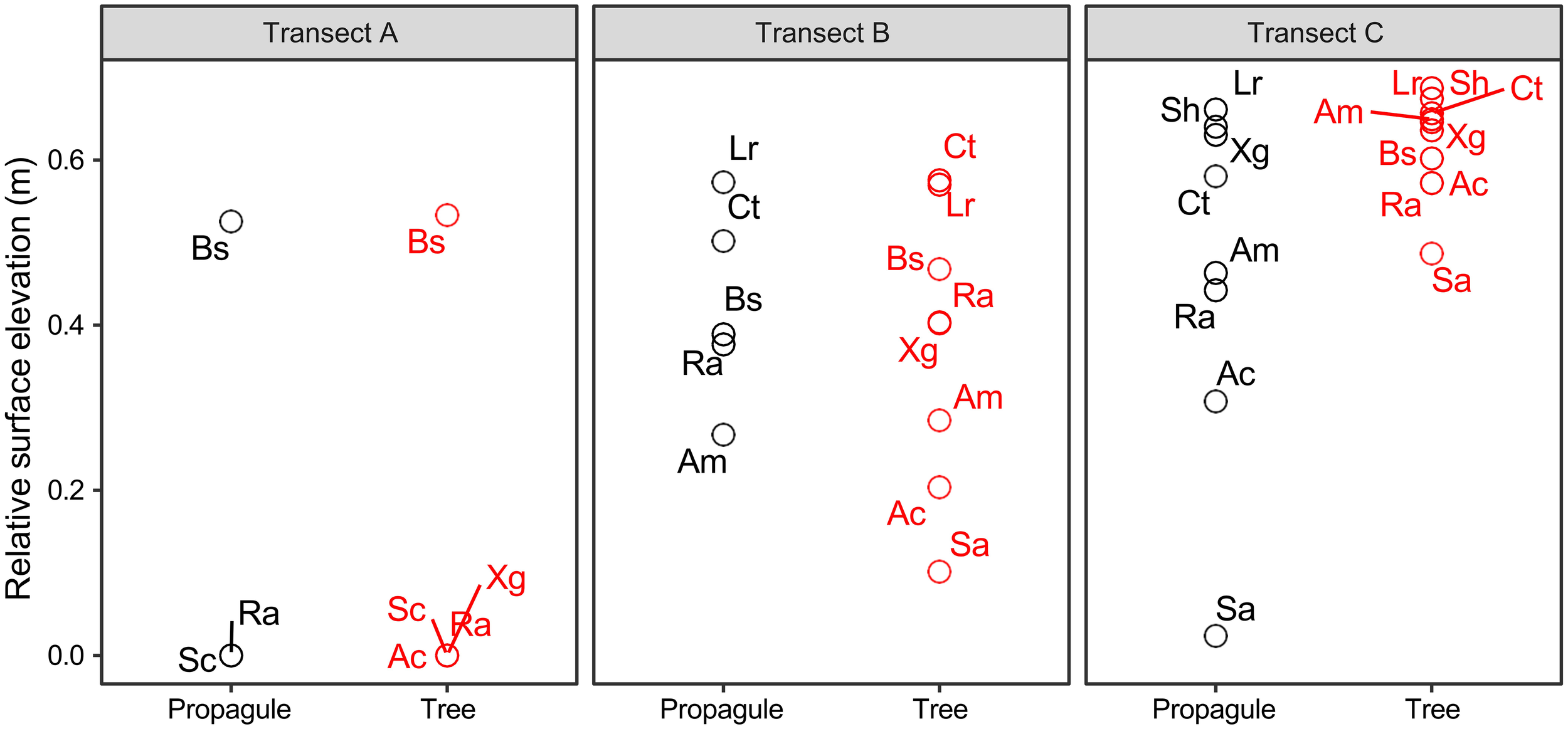Relative surface elevations of mangrove propagules and mature individuals of mangrove plants (tree) in transect A-C along Bamen bay, Hainan Island, China. (Sa, Sonneratia alba; Sc, Sonneratia caseolaris; Ra, Rhizophora apiculata; Ct, Ceriops tagal; Ac, Aegiceras corniculatum; Bs, Bruguiera sexangula; Am, Avicennia marina; Lr, Lumntizera racemosa; Xg, Xylocarpus granatum; Sh, Scyphiphora hydropyllacea).