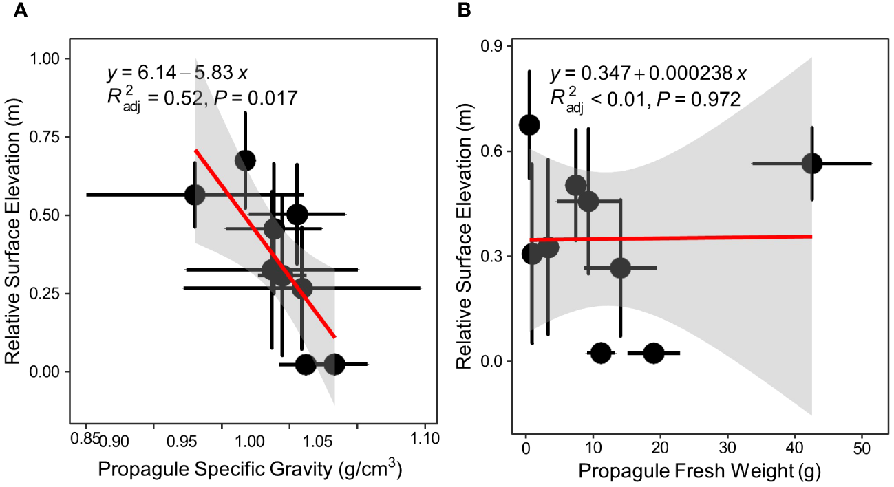 Mean and standard deviation (SD) values of propagule specific gravity and fresh weight of each species were calculated. A t-test was used to test whether differences are significant in specific gravity and weight between true mangroves and semi-mangrove. S. hydropyllacea propagules were most abortive and our study did not test for maturity on a case-by-case basis; thus, the correlation between their propagule specific gravity/weight and the relative surface elevation of their distribution was not explored. Then we determined correlations between specific gravity/weight and the relative surface elevation of propagule dispersal. The tests were conducted and figures created using RStudio (4.0.4).