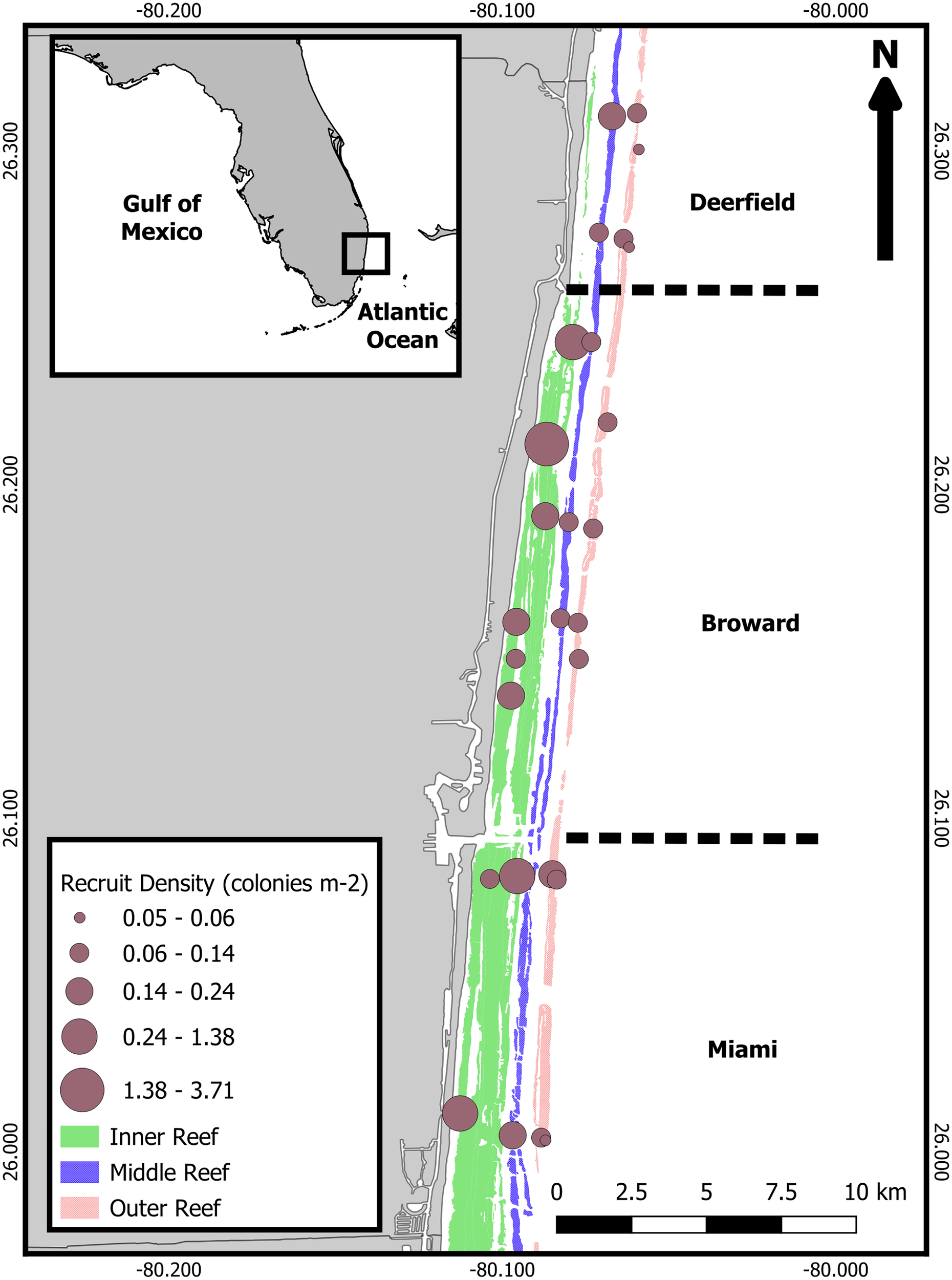 Map of study area and monitoring sites. Reef habitats run parallel from shore, inshore to offshore: inner reef (comprised of a nearshore ridge complex and linear inner reef), middle reef, and outer reef (deep outer reef sites on the eastern edge of the outer reef). Divisions of the Deerfield (north, six sites), Broward/Fort Lauderdale (central, 13 sites), and Hollywood/Miami (south, eight sites) sub-regions are identified by dashed lines perpendicular to shoreline. Size of the site points corresponds to recruit density (colonies/m2). Inset map: study location marked with black box. Study locations and spatial designations are in Supplementary Table 1.