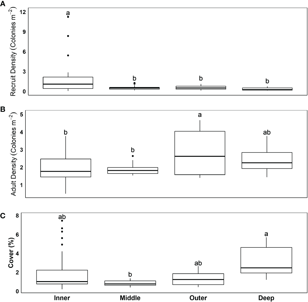 Spatial variation in (A) recruit density, (B) adult colony density, and (C) cover, based on reef habitat. Values are averaged over years. Lower case letters represent significant differences between post-hoc Tukey pairwise analysis of GLMMs. Significance is at p < 0.05.
