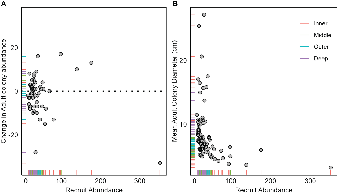 Relationship between recruit abundance in year x and (A) change in adult (≥2 cm maximum diameter) colony abundance from x to x + 1 (i.e., absolute change from year 1 to year 2 is plotted against recruit abundance in year 1) and (B) mean adult colony diameter in year x. Each point represents a sample (site surveyed in 1 year). Tick marks on axis represent sample positions and are color-coded by habitat. Dashed line in panel A is at 0 and represents no change in colony abundance. Samples above the dashed line represent influx of recruits into the adult assemblage, with samples below having a loss of adult colonies. Note the large discrepancy between the scale of recruit abundance and change in adult colony abundance.