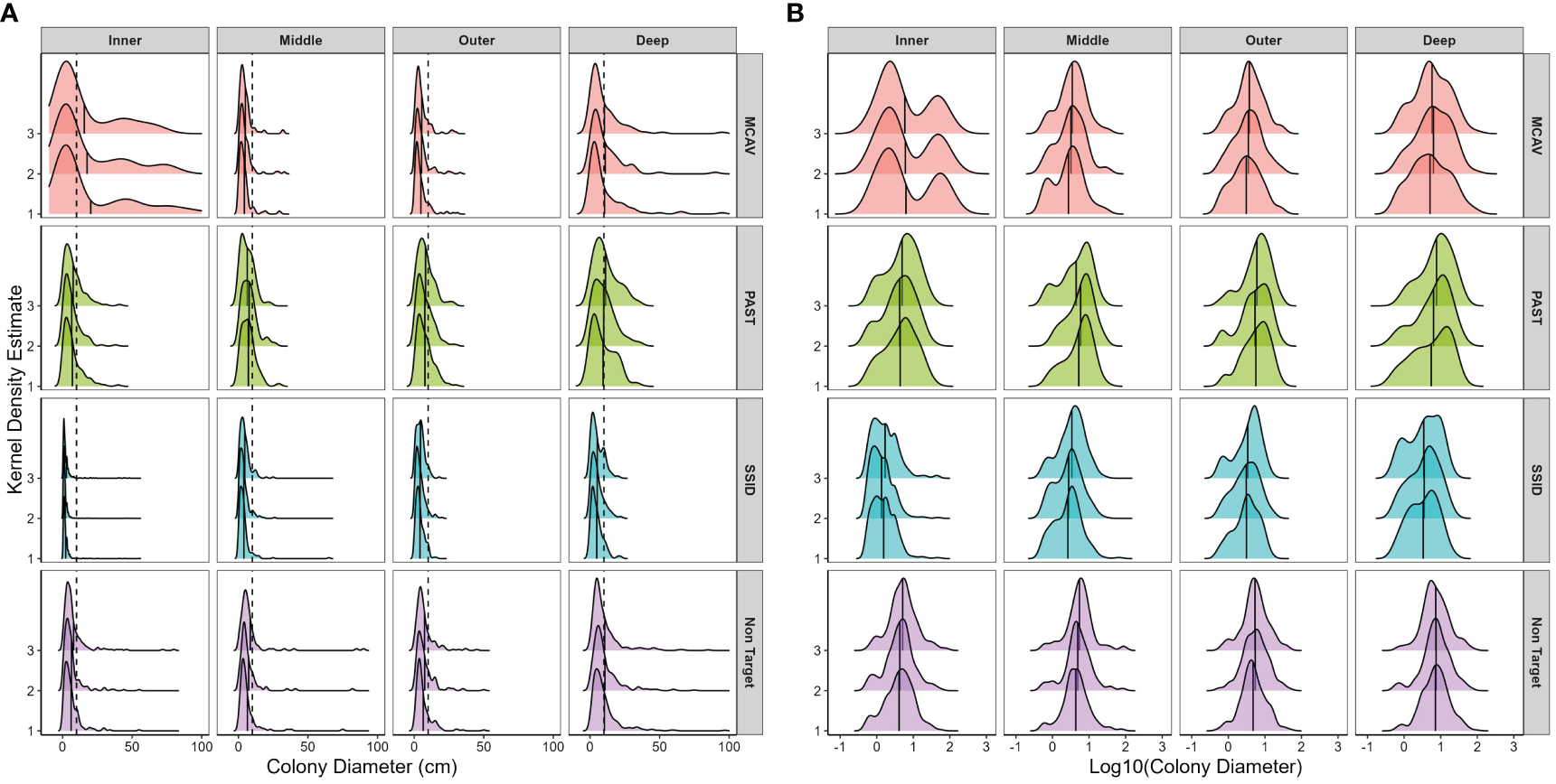 Spatial and temporal variations in size frequency distributions using (A) untransformed and (B) log10-transformed maximum colony diameter separated by target species. Panels from top to bottom: MCAV, Montastraea cavernosa; PAST, Porites astreoides; SSID, Siderastrea siderea; Non-Target, all other species. Panels from left to right moving offshore: nearshore ridge/inner reef, middle reef, outer reef, and deep outer reef. Within each panel, histograms are separated by survey year. Frequency estimated by kernel density estimate, which uses kernel smoothing (the weighted average of the observed data) for probability density estimation (using a smoothed histogram) for each species/habitat combination. See Supplementary Table 25 for observed density per species in each habitat in each survey year. Vertical dashed line in panel (A) marks 10 cm maximum diameter and the approximate size at puberty in M. cavernosa, P. astreoides, and S. siderea (Soong, 1993) and highlights the low frequency of few mid-sized or large colonies. Solid vertical line within histograms represents the mean size per species, per habitat, and per year. Note that in panel (A), maximum colony diameter was limited to 100 cm for graphical display due to paucity of larger colonies.