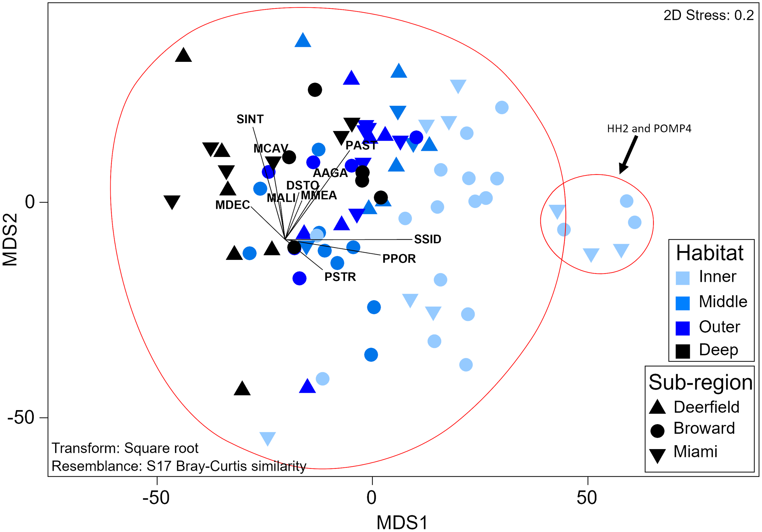 Recruit assemblage composition significantly varied by habitat (PERMANOVA, Pseudo-f = 6.85, p = 0.0001) with a significant interaction between habitat and sub-region (Pseudo-f = 1.78, p = 0.02), but did not vary temporally. Recruit assemblage composition varied significantly between all habitats except the middle and outer reefs (p < 0.01, Supplementary Table 24). Inner reef sites had higher relative S. siderea and P. porites recruit density and low diversity and evenness (H′ = 0.6; J′ = 0.2; Figure 5). Recruit diversity and evenness increased moving offshore and were highest on the deep outer reef (H′ = 1.5; J′ = 0.7). Recruit assemblage composition did not significantly vary between sub-regions on inner or deep outer reefs, but recruitment in the northernmost sub-region (Deerfield) was significantly different from that in the central sub-region (Broward) on the middle reef (t = 2.1, p = 0.008), and the recruit assemblage in Broward and the southernmost sub-region (Miami) varied on the outer reef (t = 2.1, p = 0.02). The middle reef in Deerfield had twice as many recruits (primarily S. siderea and Stephanocoenia intersepta) as the middle reef in Broward. The outer reef in Miami had three times as many M. cavernosa recruits as the outer reef in Broward. SIMPROF analysis found that recruit assemblage composition split into two groups (Pi = 0.73, p = 0.02; Figure 5). One group was made up of two low-cover sites within 500 m of the shoreline, HH2 and POMP4, which had twice as many S. siderea recruits than at any other site. The other group contained all other samples and was comparatively diverse. No recruits with arborescent or corymbose morphologies were found. Two sites had recruits with laminar morphologies, and only one Orbicella sp. recruit was found (Supplementary Figure 8).