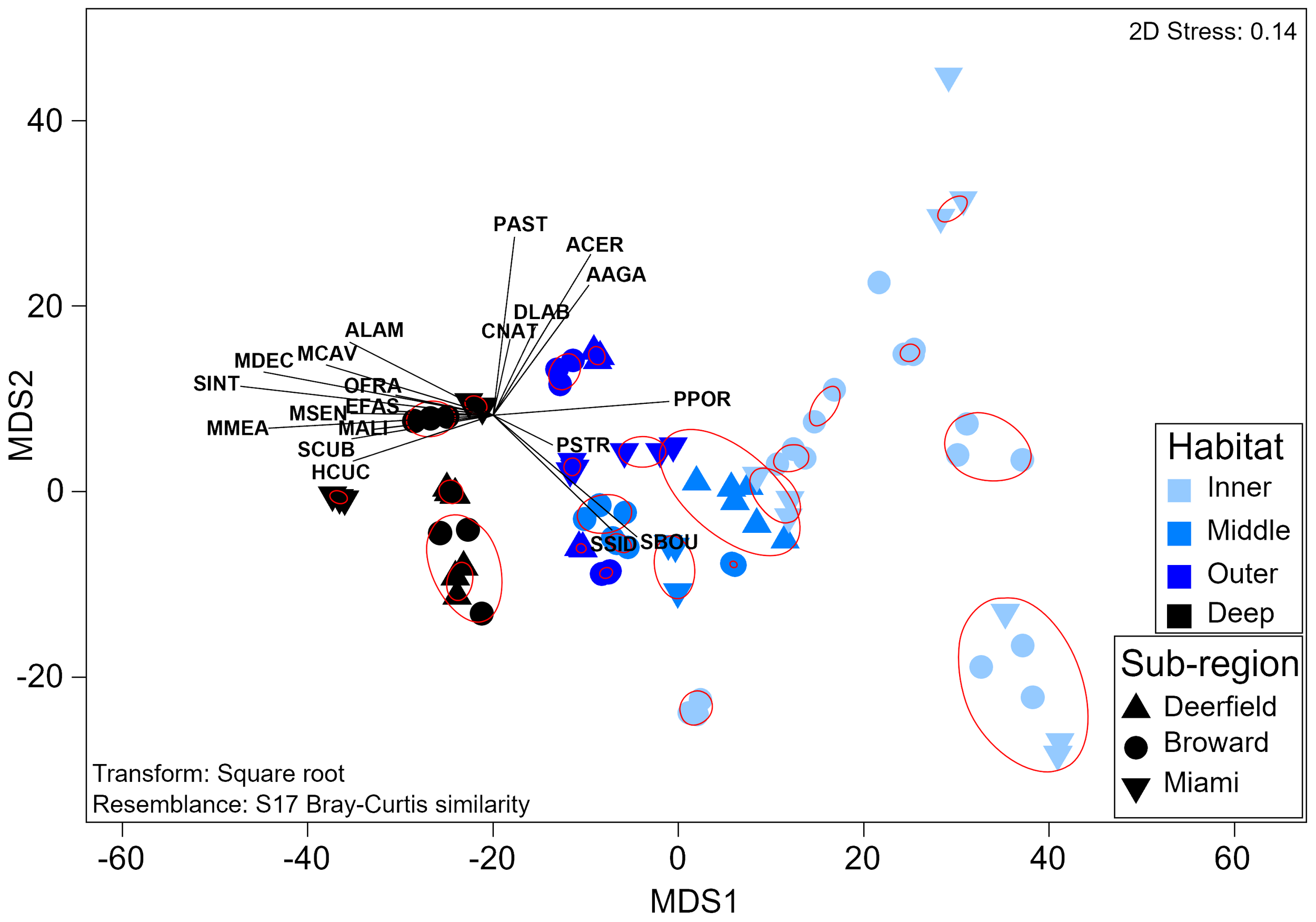 Threshold metric multidimensional scaling plot of adult coral assemblage composition. Each sample represents the assemblage composition at one site during one survey year. Red circles symbolize significant groups identified by SIMPROF. Vectors represent coral species. Labels comprise the first letter of the genus and the first three letters of the species (Supplementary Table 2). SIMPROF, similarity profile routine.