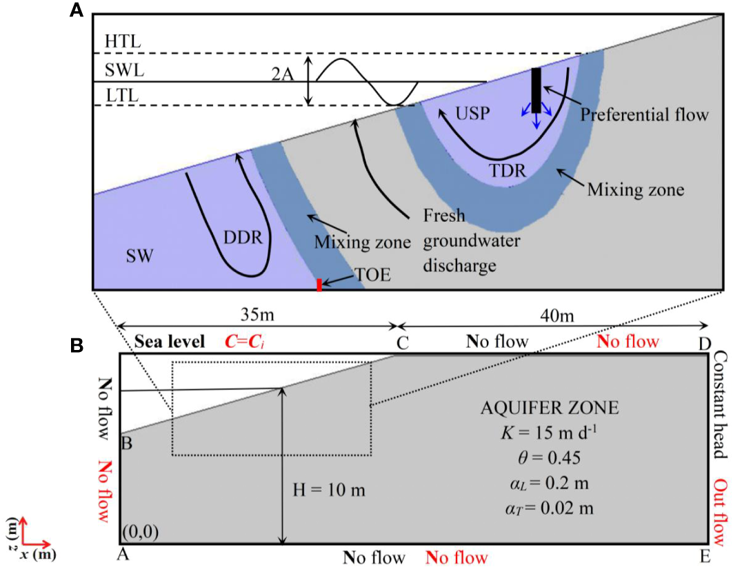 (A) Conceptual diagram of the seawater level, groundwater flow, and salinity distribution in a near-shore aquifer under tide action. Still water level (SWL), high tide level (HTL), low tide level (LTL), the black area is the preferential flow, the blue arrows indicate the direction of preferential flow. The upper saline plume (USP) formed by tide-driven recirculation (TDR), the saltwater wedge formed by density-driven recirculation (DDR), and the saltwater wedge toe (TOE) are shown. The freshwater–saltwater mixing zone associated with the saline plums are also depicted. (B) Numerical model domain, parameters, and boundary condition, the dashed box in (B) illustrates the area depicted in (A).