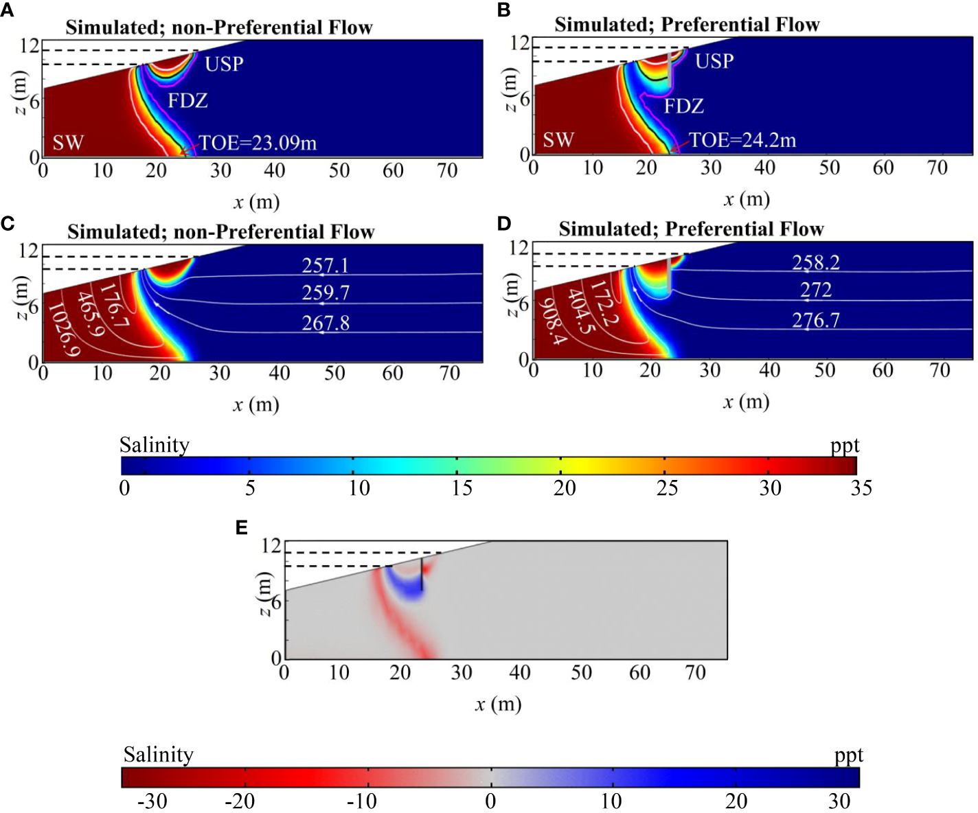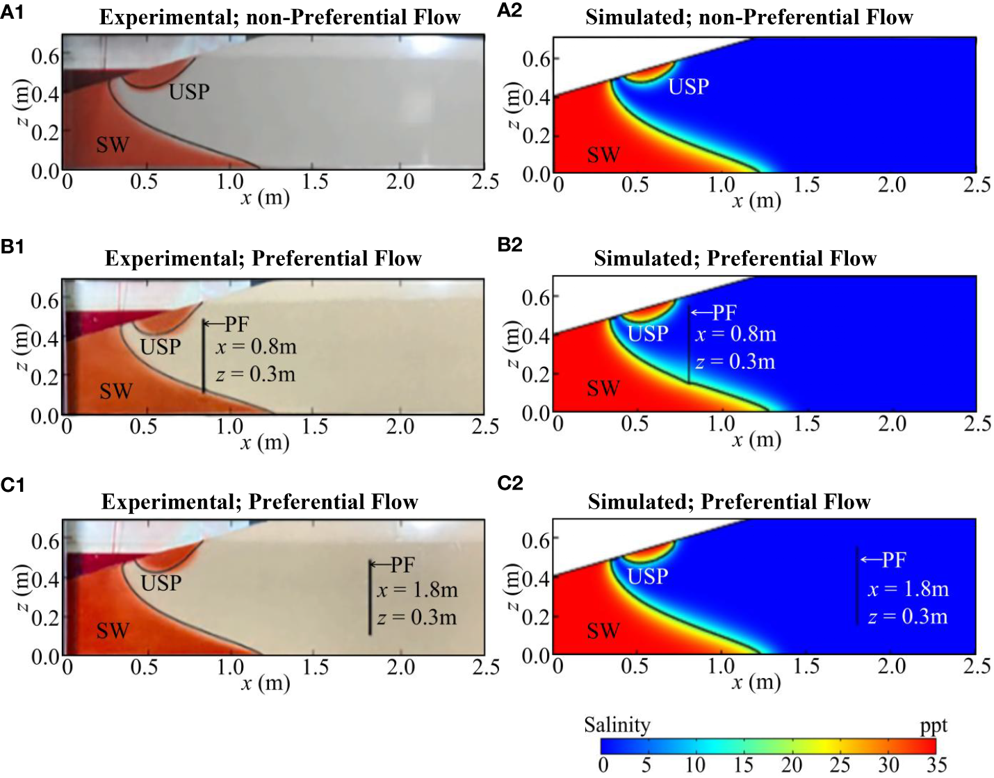 From the experimental results in Xie et al. (2023) and numerical simulation results (Figure 2), the simulated results matched the experimental in all cases well (Figure 2). We can find that tidal forcing formed a USP and SW in the intertidal zone where saltwater infiltrated near the high tide mark and was discharged near the low tide mark. A fresh groundwater discharge zone (FDZ) separated the circulation cell from the lower interface located at the base of the beach. As expected, under the impact of preferential flow, when the preferential flow location is at x = 0.8 m, it has some effect on the salinity distribution and reduces the saltwater wedge deed extension. When the preferential flow location was at x =1.8 m, it has little effect on the salinity distribution, which is consistent with the salinity distribution pattern of the no-preferential flow condition.